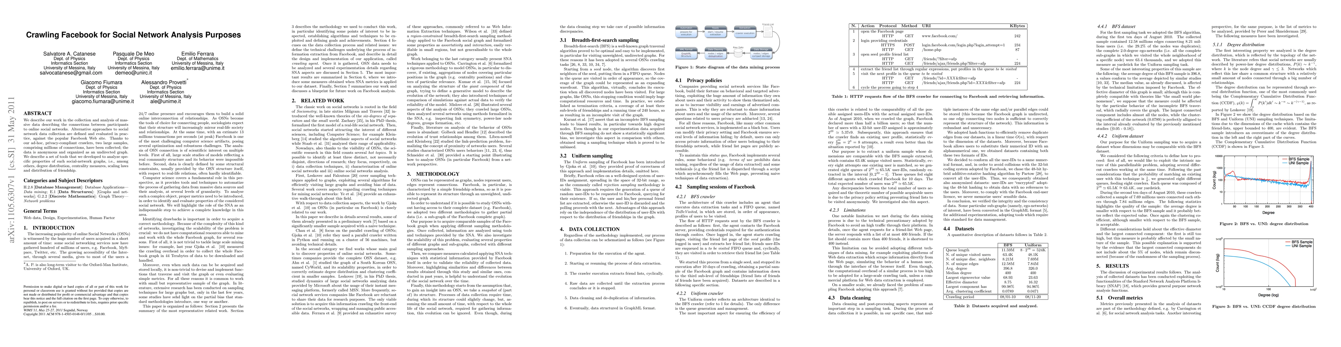 We describe our work in the collection and analysis of massive data describing the connections between participants to online social networks. Alternative approaches to social network data collection are defined and evaluated in practice, against the popular Facebook Web site. Thanks to our ad-hoc, privacy-compliant crawlers, two large samples, comprising millions of connections, have been collected; the data is anonymous and organized as an undirected graph. We describe a set of tools that we developed to analyze specific properties of such social-network graphs, i.e., among others, degree distribution, centrality measures, scaling laws and distribution of friendship.