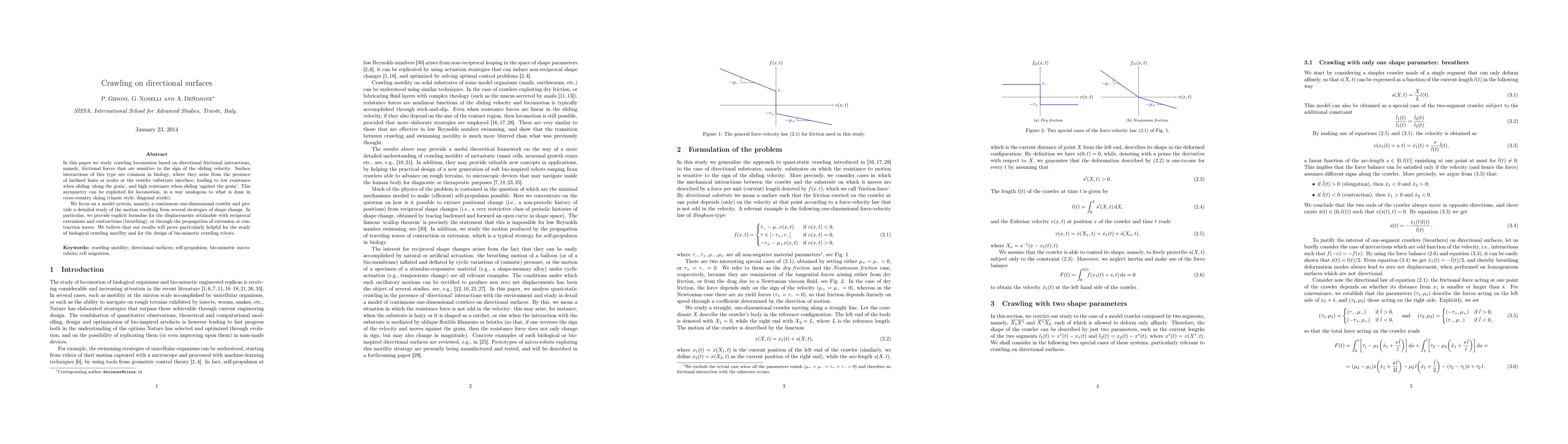 This paper explores crawling locomotion on directional surfaces using asymmetric frictional interactions, drawing inspiration from biological mechanisms like inclined hairs. It models a one-dimensional crawler and analyzes various shape-changing strategies, providing equations for achievable displacements, which could aid in understanding biological motility and designing bio-mimetic robots.