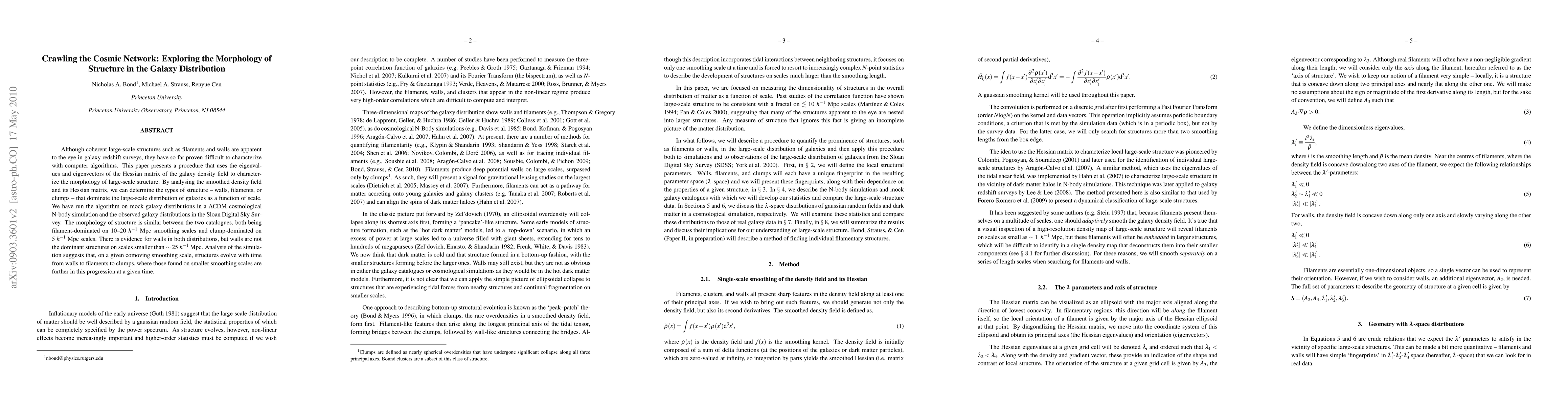 Although coherent large-scale structures such as filaments and walls are apparent to the eye in galaxy redshift surveys, they have so far proven difficult to characterize with computer algorithms. This paper presents a procedure that uses the eigenvalues and eigenvectors of the Hessian matrix of the galaxy density field to characterize the morphology of large-scale structure. By analysing the smoothed density field and its Hessian matrix, we can determine the types of structure - walls, filaments, or clumps - that dominate the large-scale distribution of galaxies as a function of scale. We have run the algorithm on mock galaxy distributions in a LCDM cosmological N-body simulation and the observed galaxy distributions in the Sloan Digital Sky Survey. The morphology of structure is similar between the two catalogues, both being filament-dominated on 10-20 h^{-1} Mpc smoothing scales and clump-dominated on 5 h^{-1} Mpc scales. There is evidence for walls in both distributions, but walls are not the dominant structures on scales smaller than ~25 h^{-1} Mpc. Analysis of the simulation suggests that, on a given comoving smoothing scale, structures evolve with time from walls to filaments to clumps, where those found on smaller smoothing scales are further in this progression at a given time.