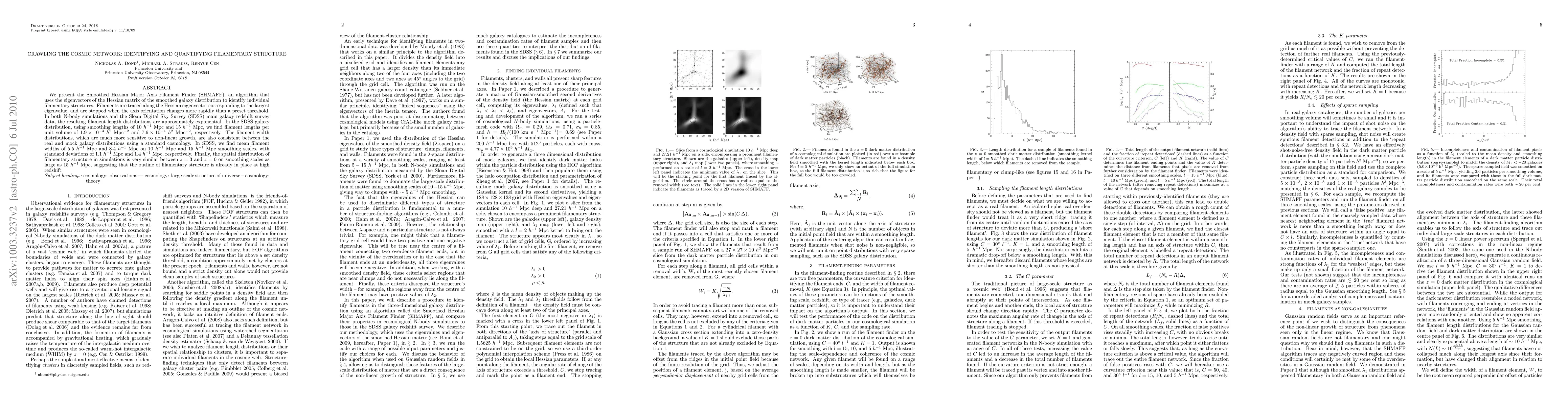We present the Smoothed Hessian Major Axis Filament Finder (SHMAFF), an algorithm that uses the eigenvectors of the Hessian matrix of the smoothed galaxy distribution to identify individual filamentary structures. Filaments are traced along the Hessian eigenvector corresponding to the largest eigenvalue, and are stopped when the axis orientation changes more rapidly than a preset threshold. In both N-body simulations and the Sloan Digital Sky Survey (SDSS) main galaxy redshift survey data, the resulting filament length distributions are approximately exponential. In the SDSS galaxy distribution, using smoothing lengths of 10 h^{-1} Mpc and 15 h^{-1} Mpc, we find filament lengths per unit volume of 1.9x10^{-3} h^2 Mpc^{-2} and 7.6x10^{-4} h^2 Mpc^{-2}, respectively. The filament width distributions, which are much more sensitive to non-linear growth, are also consistent between the real and mock galaxy distributions using a standard cosmology. In SDSS, we find mean filament widths of 5.5 h^{-1} Mpc and 8.4 h^{-1} Mpc on 10 h^{-1} Mpc and 15 h^{-1} Mpc smoothing scales, with standard deviations of 1.1 h^{-1} Mpc and 1.4 h^{-1} Mpc, respectively. Finally, the spatial distribution of filamentary structure in simulations is very similar between z=3 and z=0 on smoothing scales as large as 15 h^{-1} Mpc, suggesting that the outline of filamentary structure is already in place at high redshift.
