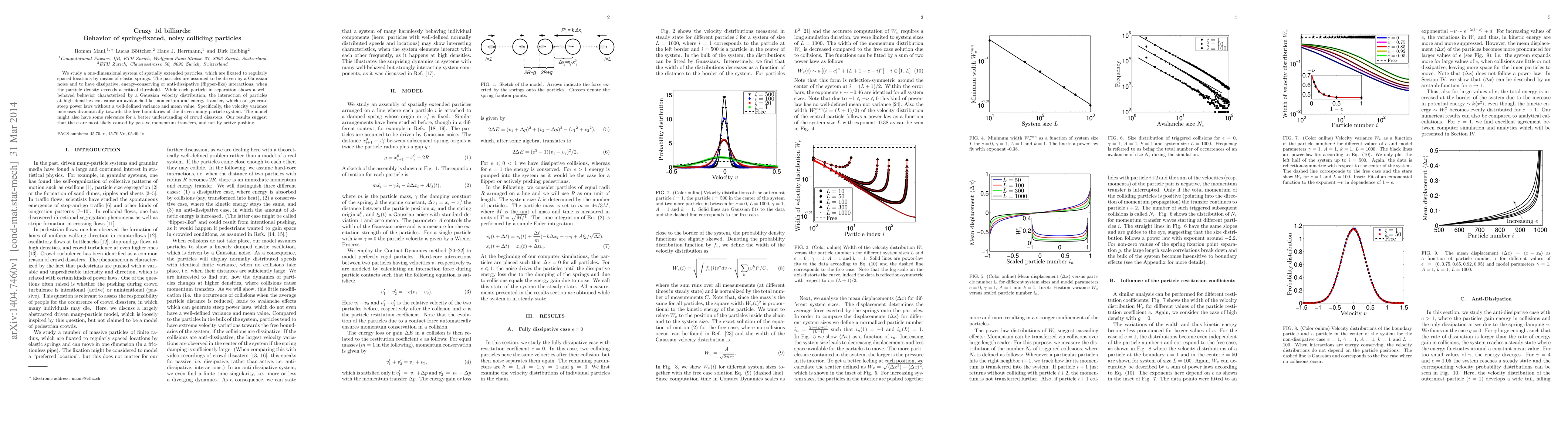 We study a one-dimensional system of spatially extended particles, which are fixated to regularly spaced locations by means of elastic springs. The particles are assumed to be driven by a Gaussian noise and to have dissipative, energy-conserving or anti-dissipative (flipper-like) interactions, when the particle density exceeds a critical threshold. While each particle in separation shows a wellbehaved behavior characterized by a Gaussian velocity distribution, the interaction of particles at high densities can cause an avalanche-like momentum and energy transfer, which can generate steep power laws without a well-defined variance and mean value. Specifically, the velocity variance increases dramatically towards the free boundaries of the driven-many-particle system. The model might also have some relevance for a better understanding of crowd disasters. Our results suggest that these are most likely caused by passive momentum transfers, and not by active pushing.