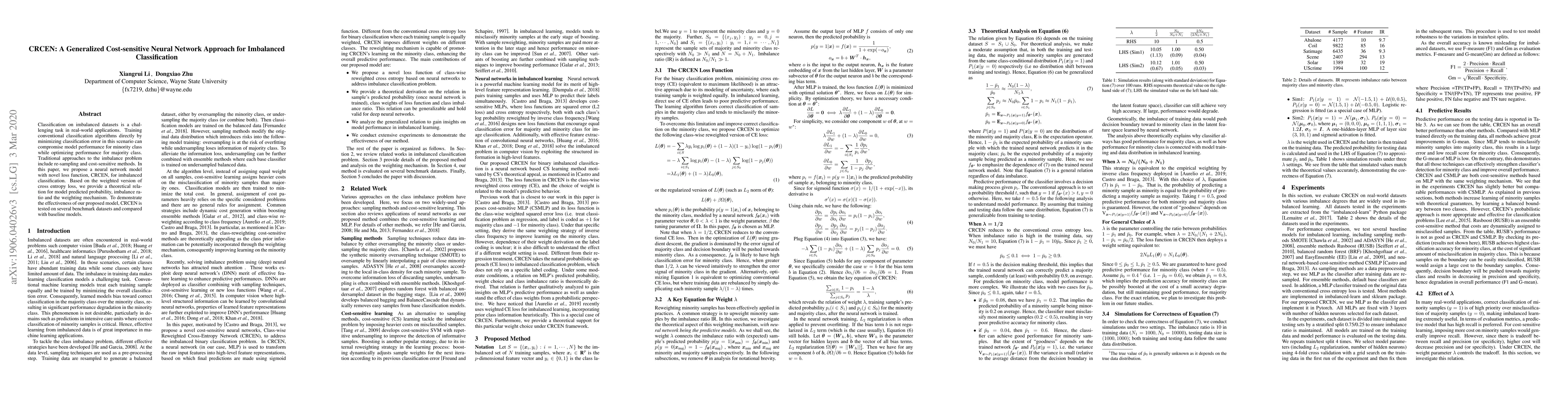 This paper introduces CRCEN, a cost-sensitive neural network model with a novel loss function designed to address imbalanced classification. CRCEN employs a weighted cross-entropy loss that theoretically relates predicted probabilities to the imbalance ratio and weighting mechanism, and it outperforms baseline models on benchmark datasets.