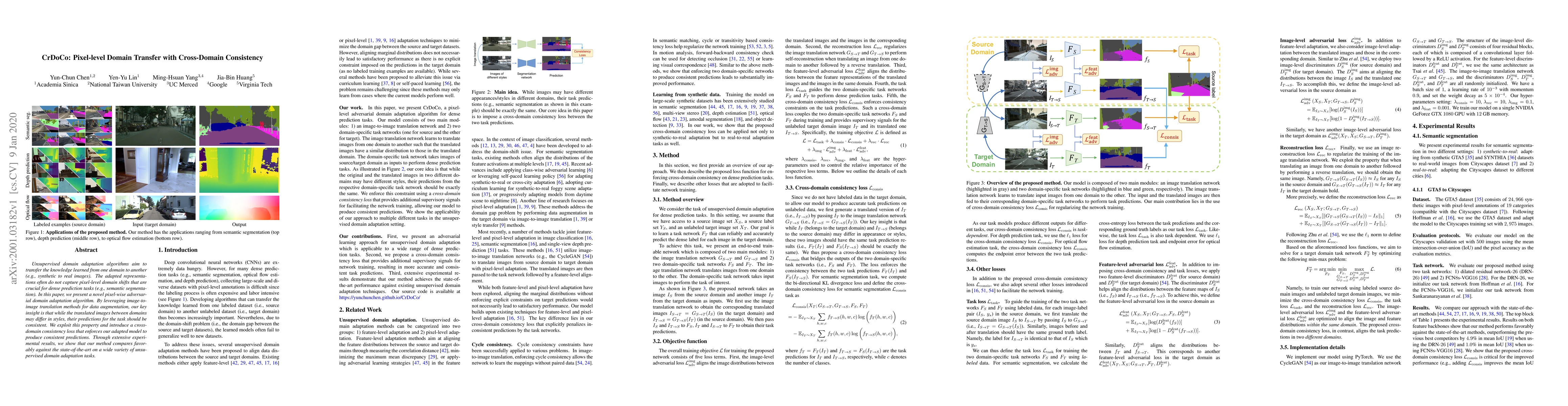 This paper introduces CrDoCo, a novel pixel-wise adversarial domain adaptation algorithm that leverages image-to-image translation for data augmentation. It employs a cross-domain consistency loss to ensure consistent task predictions across domains, achieving state-of-the-art performance in unsupervised domain adaptation tasks.