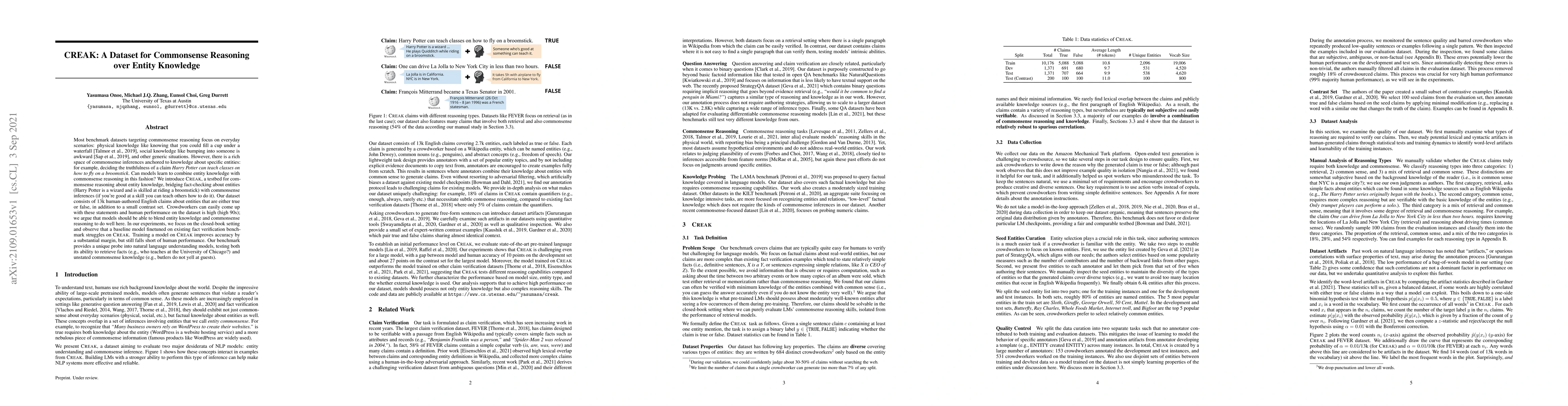 CREAK is a dataset for evaluating commonsense reasoning about specific entities, consisting of 13k human-authored claims about entities that are either true or false. While models show improvement over baselines when trained on CREAK, they still lag behind human performance, highlighting a gap in blending entity knowledge with commonsense reasoning.