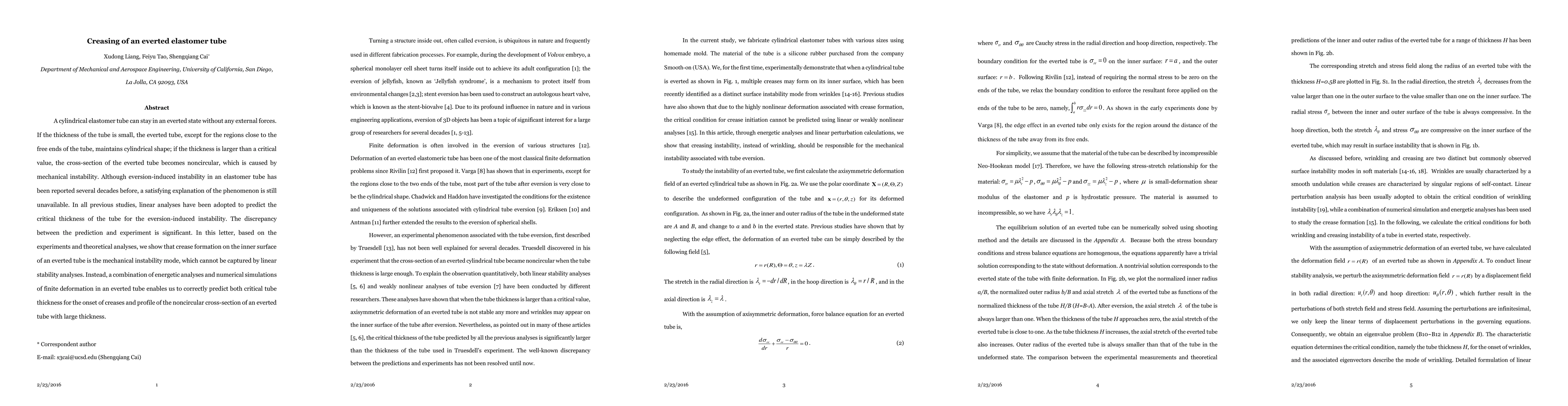A cylindrical elastomer tube can stay in an everted state without any applied external forces. If the thickness of the tube is small, the everted tube, except for the regions close to the two ends of the tube, is cylindrical, if the thickness is larger than a critical value, the cross-section of the everted tube becomes noncircular, which is due to mechanical instability. Although the eversion-induced mechanical instability in an elastomer tube has been reported several decades ago, a satisfying explanation of the phenomenon is still unavailable. In all previous studies, linear stability analyses have been commonly adopted to predict the critical thickness of the tube for the eversion-induced instability. The discrepancy between the prediction and experiment is significant and well known. In this letter, based on the experiments and theoretical analyses, we show that crease formation on the inner surface of an everted tube is the mechanical instability mode, which cannot be captured by linear stability analyses. Instead, a combination of energetic analyses and numerical simulation of highly nonlinear deformation enables us to correctly predict both the critical thickness of the tube for the onset of creases and the profile of the cross-section of an everted tube with multiple creases on its inner surface.