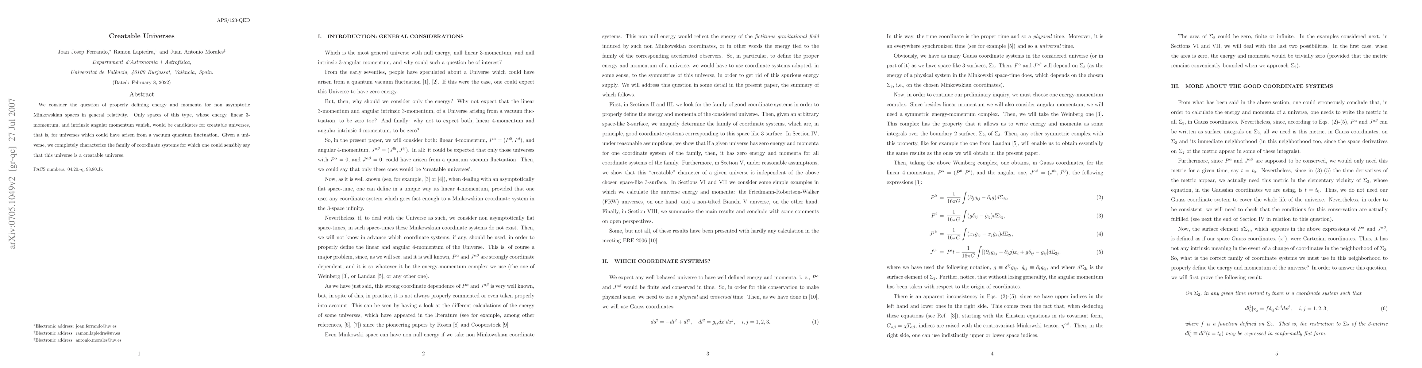 We consider the question of properly defining energy and momenta for non asymptotic Minkowskian spaces in general relativity. Only spaces of this type, whose energy, linear 3-momentum, and intrinsic angular momentum vanish, would be candidates for creatable universes, that is, for universes which could have arisen from a vacuum quantum fluctuation. Given a universe, we completely characterize the family of coordinate systems for which one could sensibly say that this universe is a creatable universe.