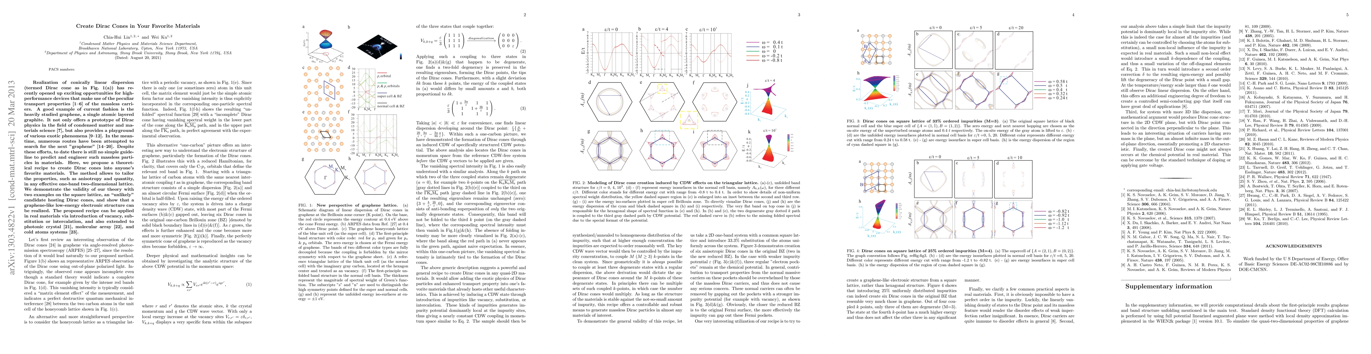 Realization of conically linear dispersion, termed as Dirac cones, has recently opened up exciting opportunities for high-performance devices that make use of the peculiar transport properties of the massless carriers. A good example of current fashion is the heavily studied graphene, a single atomic layered graphite. It not only offers a prototype of Dirac physics in the field of condensed matter and materials science, but also provides a playground of various exotic phenomena. In the meantime, numerous routes have been attempted to search for the next "graphene". Despite these efforts, to date there is still no simple guideline to predict and engineer such massless particles in materials. Here, we propose a theoretical recipe to create Dirac cones into anyone's favorite materials. The method allows to tailor the properties, such as anisotropy and quantity, in any effective one-band two-dimensional lattice. We demonstrate the validity of our theory with two examples on the square lattice, an "unlikely" candidate hosting Dirac cones, and show that a graphene-like low-energy electronic structure can be realized. The proposed recipe can be applied in real materials via introduction of vacancy, substitution or intercalation, and also extended to photonic crystal, molecular array, and cold atoms systems.