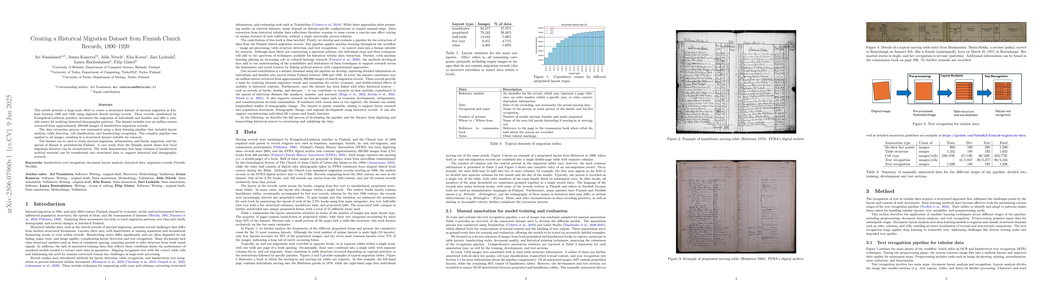 This article presents a large-scale effort to create a structured dataset of internal migration in Finland between 1800 and 1920 using digitized church moving records. These records, maintained by Evangelical-Lutheran parishes, document the migration of individuals and families and offer a valuable source for studying historical demographic patterns. The dataset includes over six million entries extracted from approximately 200,000 images of handwritten migration records. The data extraction process was automated using a deep learning pipeline that included layout analysis, table detection, cell classification, and handwriting recognition. The complete pipeline was applied to all images, resulting in a structured dataset suitable for research. The dataset can be used to study internal migration, urbanization, and family migration, and the spread of disease in preindustrial Finland. A case study from the Elim\"aki parish shows how local migration histories can be reconstructed. The work demonstrates how large volumes of handwritten archival material can be transformed into structured data to support historical and demographic research.