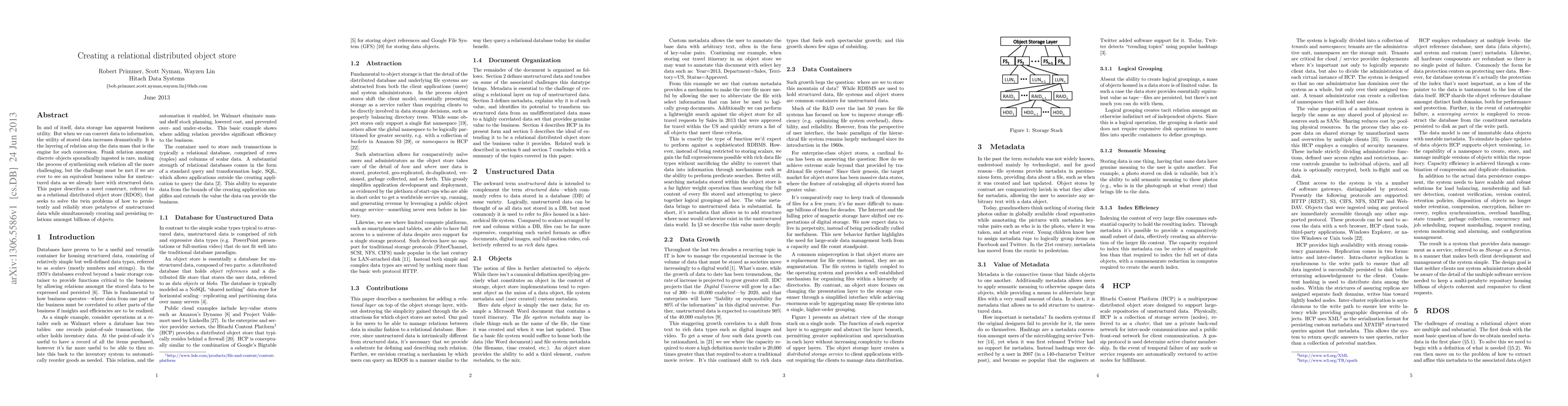 In and of itself, data storage has apparent business utility. But when we can convert data to information, the utility of stored data increases dramatically. It is the layering of relation atop the data mass that is the engine for such conversion. Frank relation amongst discrete objects sporadically ingested is rare, making the process of synthesizing such relation all the more challenging, but the challenge must be met if we are ever to see an equivalent business value for unstructured data as we already have with structured data. This paper describes a novel construct, referred to as a relational distributed object store (RDOS), that seeks to solve the twin problems of how to persistently and reliably store petabytes of unstructured data while simultaneously creating and persisting relations amongst billions of objects.