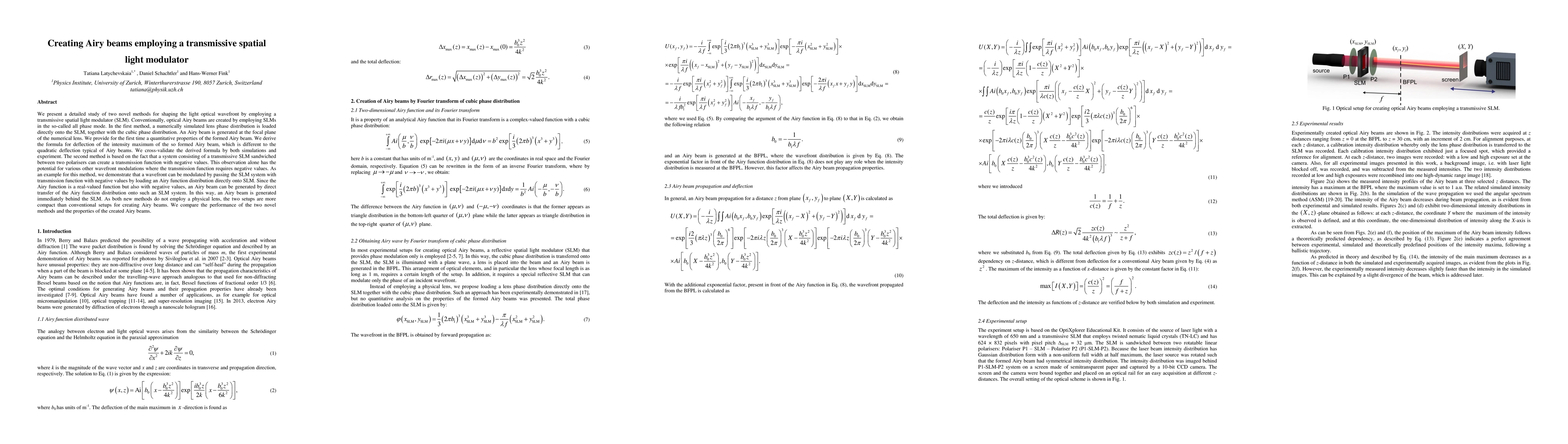 We present a detailed study of two novel methods for shaping the light optical wavefront by employing a transmissive spatial light modulator (SLM). Conventionally, optical Airy beams are created by employing SLMs in the so-called all phase mode. In the first method, a numerically simulated lens phase distribution is loaded directly onto the SLM, together with the cubic phase distribution. An Airy beam is generated at the focal plane of the numerical lens. We provide for the first time a quantitative properties of the formed Airy beam. We derive the formula for deflection of the intensity maximum of the so formed Airy beam, which is different to the quadratic deflection typical of Airy beams. We cross-validate the derived formula by both simulations and experiment. The second method is based on the fact that a system consisting of a transmissive SLM sandwiched between two polarisers can create a transmission function with negative values. This observation alone has the potential for various other wavefront modulations where the transmission function requires negative values. As an example for this method, we demonstrate that a wavefront can be modulated by passing the SLM system with transmission function with negative values by loading an Airy function distribution directly onto SLM. Since the Airy function is a real-valued function but also with negative values, an Airy beam can be generated by direct transfer of the Airy function distribution onto such an SLM system. In this way, an Airy beam is generated immediately behind the SLM. As both new methods do not employ a physical lens, the two setups are more compact than conventional setups for creating Airy beams. We compare the performance of the two novel methods and the properties of the created Airy beams.