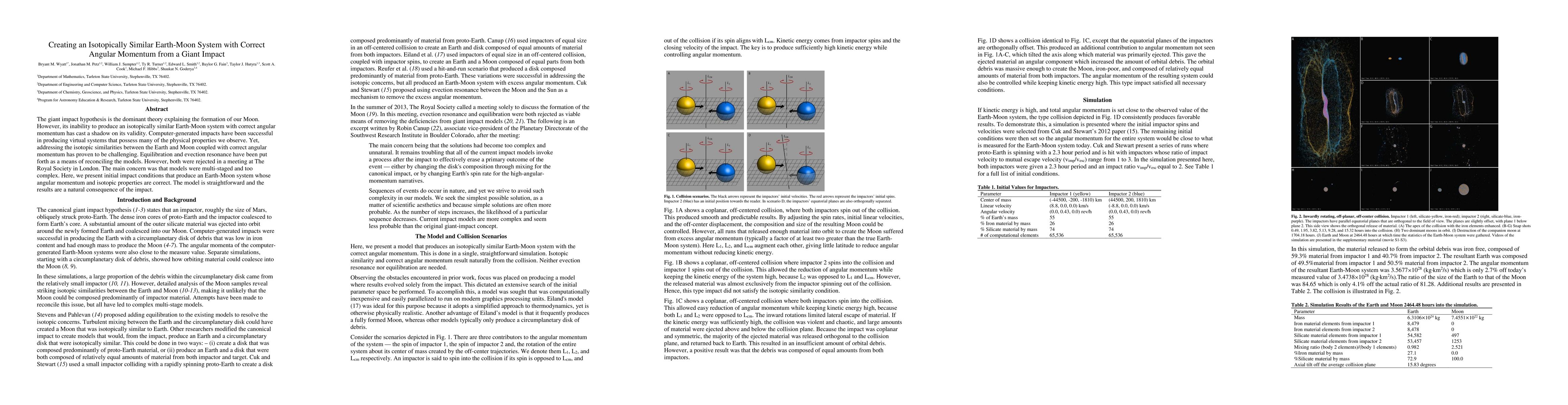 The giant impact hypothesis is the dominant theory explaining the formation of our Moon. However, its inability to produce an isotopically similar Earth-Moon system with correct angular momentum has cast a shadow on its validity. Computer-generated impacts have been successful in producing virtual systems that possess many of the physical properties we observe. Yet, addressing the isotopic similarities between the Earth and Moon coupled with correct angular momentum has proven to be challenging. Equilibration and evection resonance have been put forth as a means of reconciling the models. However, both were rejected in a meeting at The Royal Society in London. The main concern was that models were multi-staged and too complex. Here, we present initial impact conditions that produce an Earth-Moon system whose angular momentum and isotopic properties are correct. The model is straightforward and the results are a natural consequence of the impact.