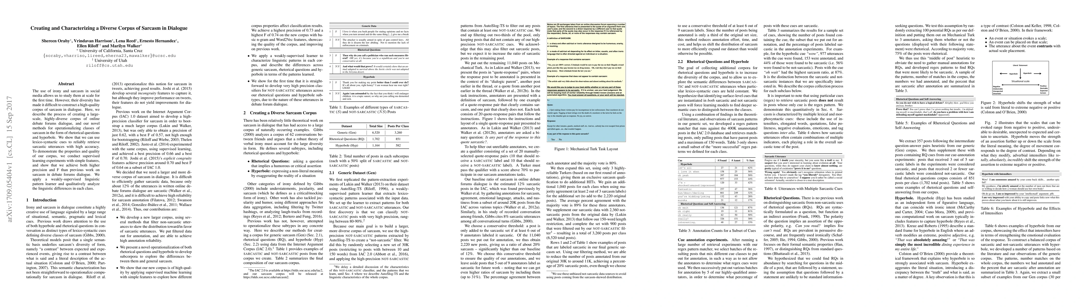 This paper details the creation of a large, diverse corpus of sarcasm in online debate forum dialogues, focusing on rhetorical questions and hyperbole. The authors demonstrate high-accuracy retrieval of sarcastic utterances using lexico-syntactic cues and show improved performance in supervised learning experiments compared to previous studies.
