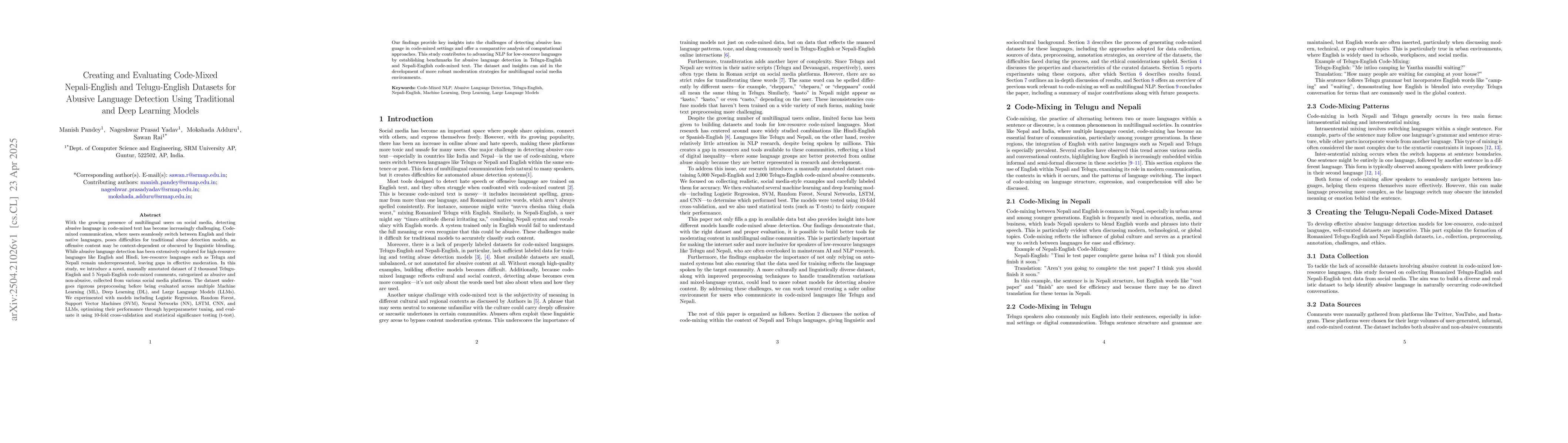 This research introduces two new datasets for detecting abusive language in code-mixed Nepali-English and Telugu-English texts, aiming to address the challenges posed by linguistic blending in social media. The study evaluates various machine learning and deep learning models, providing insights into effective approaches for low-resource language moderation. For more details, refer to the original paper.