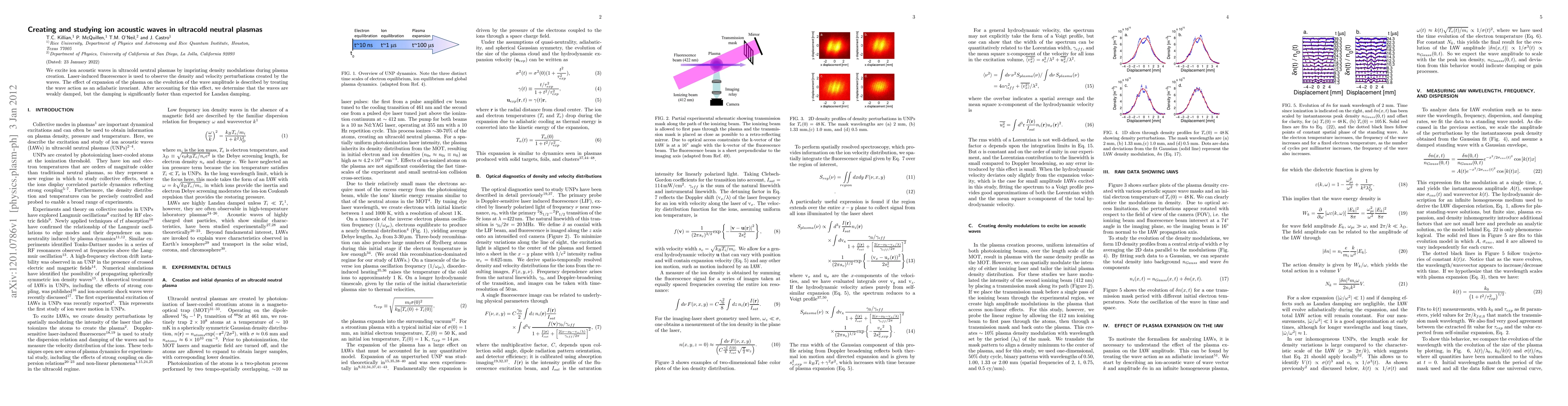 This study excites ion acoustic waves in ultracold neutral plasmas via density modulations during plasma creation, observing them with laser-induced fluorescence. The wave amplitude evolution is analyzed considering plasma expansion as an adiabatic invariant, revealing weak damping that exceeds traditional Landau damping predictions.