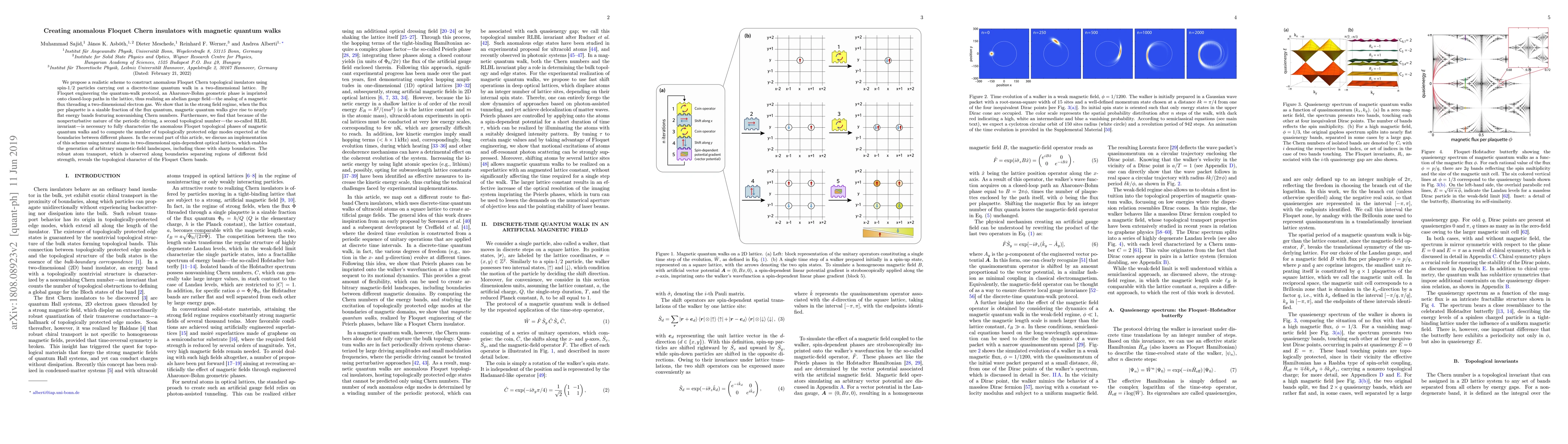 We propose a realistic scheme to construct anomalous Floquet Chern topological insulators using spin-1/2 particles carrying out a discrete-time quantum walk in a two-dimensional lattice. By Floquet engineering the quantum-walk protocol, an Aharonov-Bohm geometric phase is imprinted onto closed-loop paths in the lattice, thus realizing an abelian gauge field---the analog of a magnetic flux threading a two-dimensional electron gas. We show that in the strong field regime, when the flux per plaquette is a sizable fraction of the flux quantum, magnetic quantum walks give rise to nearly flat energy bands featuring nonvanishing Chern numbers. Furthermore, we find that because of the nonperturbative nature of the periodic driving, a second topological number---the so-called RLBL invariant---is necessary to fully characterize the anomalous Floquet topological phases of magnetic quantum walks and to compute the number of topologically protected edge modes expected at the boundaries between different phases. In the second part of this article, we discuss an implementation of this scheme using neutral atoms in two-dimensional spin-dependent optical lattices, which enables the generation of arbitrary magnetic-field landscapes, including those with sharp boundaries. The robust atom transport, which is observed along boundaries separating regions of different field strength, reveals the topological character of the Floquet Chern bands.