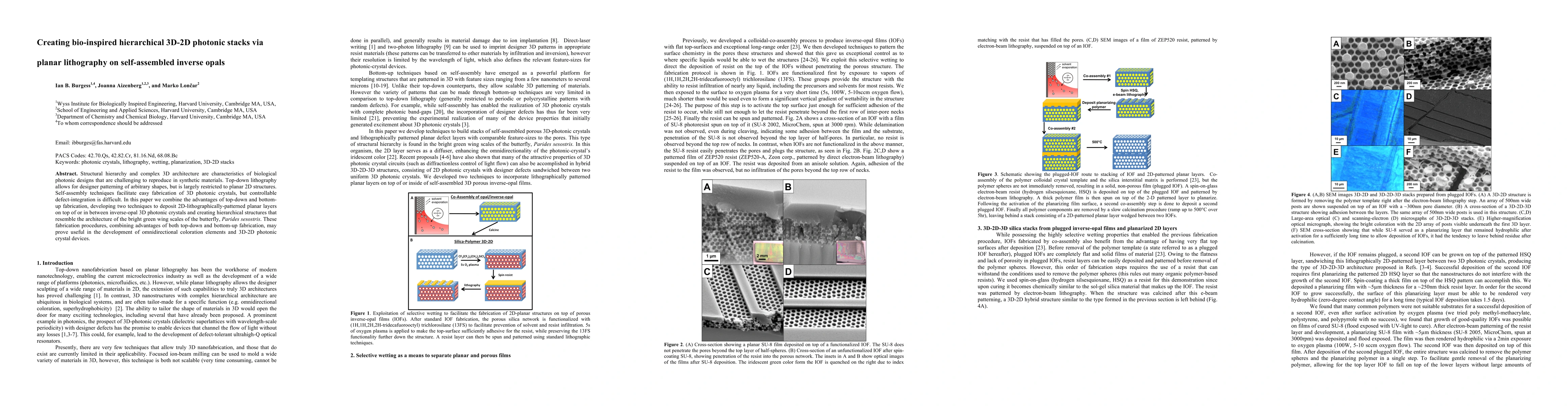 This research combines top-down lithography and self-assembled inverse opals to create hierarchical 3D-2D photonic stacks, mimicking the complex architecture of butterfly wing scales for potential applications in omnidirectional coloration and photonic devices. The developed techniques allow for precise defect-integration within 3D photonic crystals.
