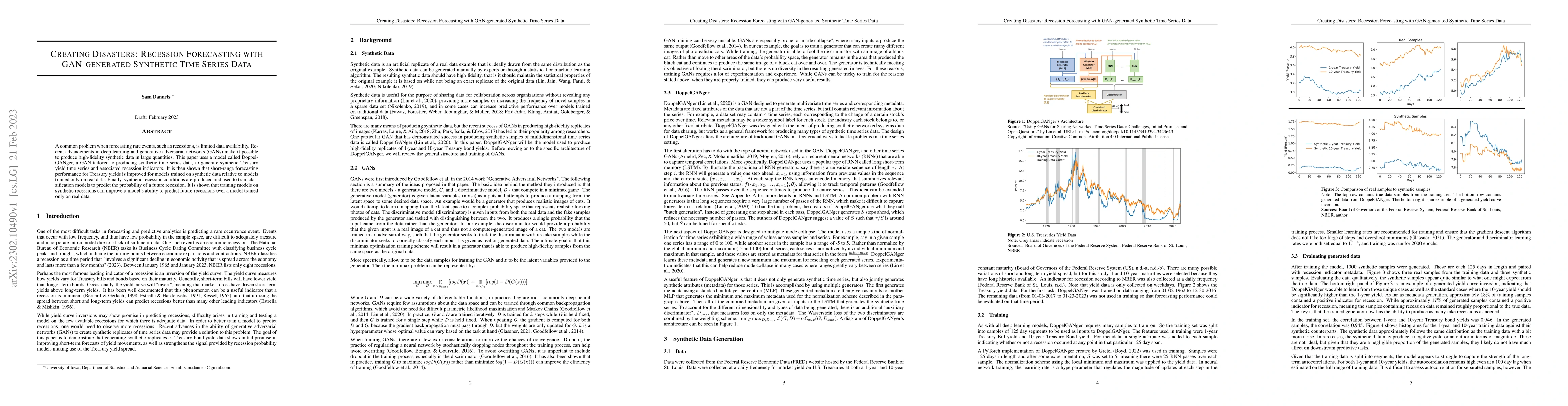 This paper explores using a GAN-generated synthetic time series to improve recession forecasting. The DoppelGANger model creates synthetic Treasury yield data and recession indicators, enhancing short-term forecasting and classification models' ability to predict future recessions.