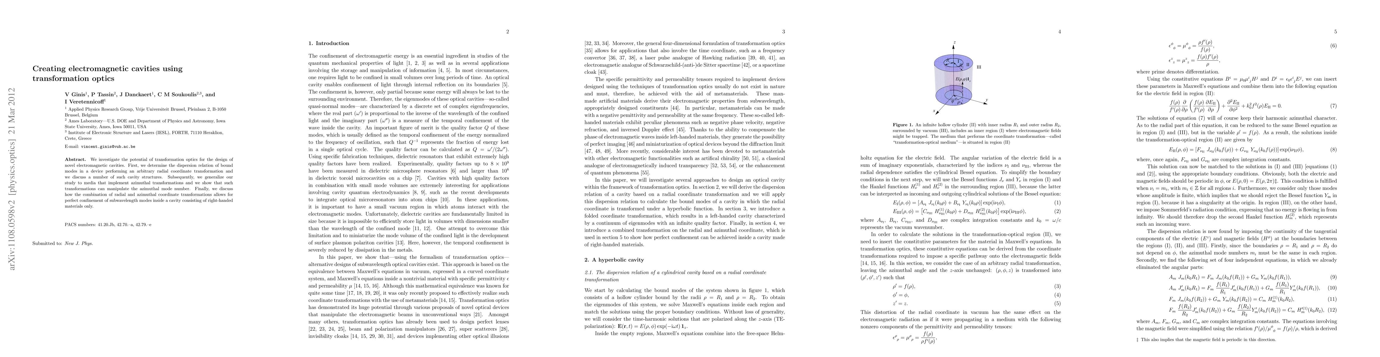 We investigate the potential of transformation optics for the design of novel electromagnetic cavities. First, we determine the dispersion relation of bound modes in a device performing an arbitrary radial coordinate transformation and we discuss a number of such cavity structures. Subsequently, we generalize our study to media that implement azimuthal transformations and we show that such transformations can manipulate the azimuthal mode number. Finally, we discuss how the combination of radial and azimuthal coordinate transformations allows for perfect confinement of subwavelength modes inside a cavity consisting of right-handed materials only.