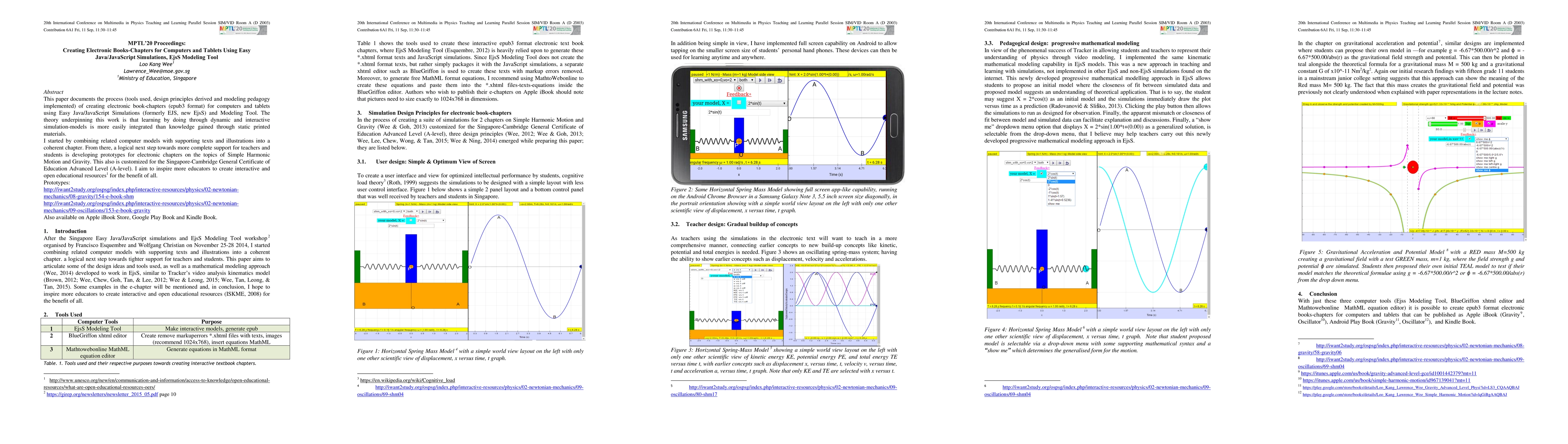 This paper shares my journey (tools used, design principles derived and modeling pedagogy implemented) when creating electronic books-chapters (epub3 format) for computers and tablets using Easy Java/JavaScript Simulations, (old name EJS, new EjsS) Modeling Tool. The theory underpinning this work grounded on learning by doing through dynamic and interactive simulation-models that can be more easily made sense of instead of the static nature of printed materials. I started combining related computer models with supporting texts and illustrations into a coherent chapter, a logical next step towards tighter support for teachers and students ,developing prototypes electronic chapters on the topics of Simple Harmonic Motion and Gravity customized for the Singapore-Cambridge General Certificate of Education Advanced Level (A-level). I aim to inspire more educators to create interactive and open educational resources for the benefit of all. Prototypes: http://iwant2study.org/ospsg/index.php/interactive-resources/physics/02-newtonian-mechanics/08-gravity/154-e-book-shm http://iwant2study.org/ospsg/index.php/interactive-resources/physics/02-newtonian-mechanics/09-oscillations/153-e-book-gravity and Apple iBook Store, Google Play Book and Kindle Book