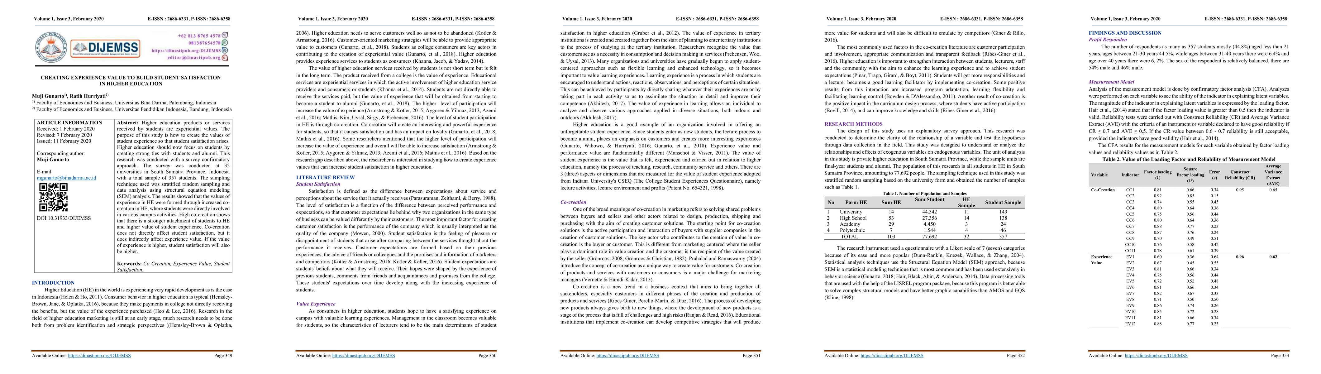 Higher education products or services received by students are experiential values. The purpose of this study is how to create the values of student experience so that student satisfaction arises. Higher education should now focus on students by creating strong ties with students and alumni. This research was conducted with a survey confirmatory approach. The survey was conducted at 32 universities in South Sumatra Province, Indonesia with a total sample of 357 students. The sampling technique used was stratified random sampling and data analysis using structural equation modeling (SEM) analysis. The results showed that the values of experience in HE were formed through increased cocreation in HE, where students were directly involved in various campus activities. High co-creation shows that there is a stronger attachment of students to HE and a higher value of student experience. Co-creation does not directly affect student satisfaction, but it does indirectly affect experience value. If the value of experience is higher, student satisfaction will also be higher.