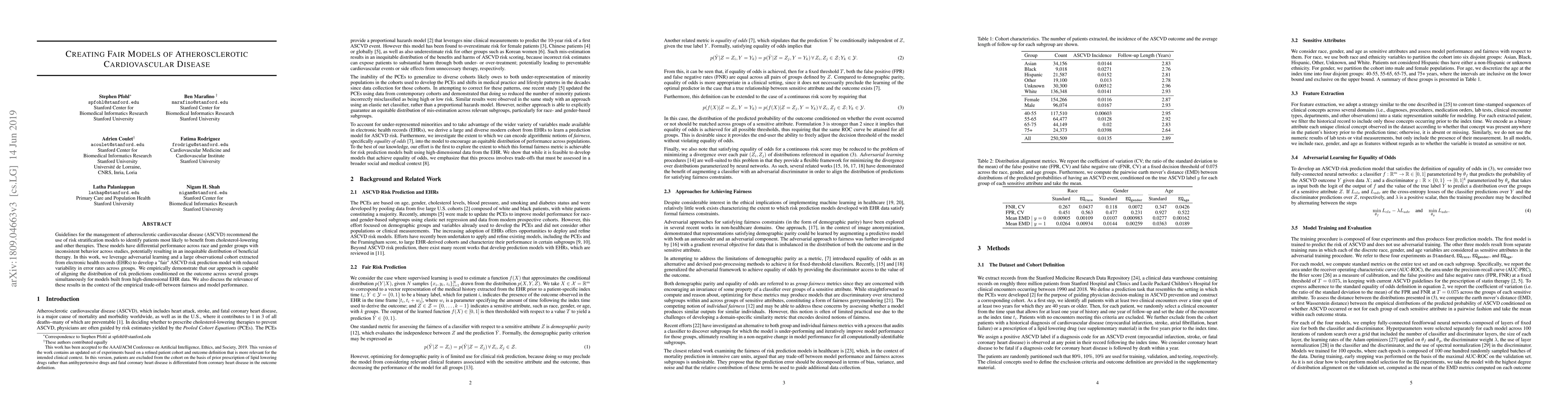 This paper develops a fair ASCVD risk prediction model using adversarial learning and large EHR data to reduce error rate variability across race and gender groups. The authors demonstrate the model's ability to align risk predictions across multiple groups while discussing the trade-off between fairness and performance.