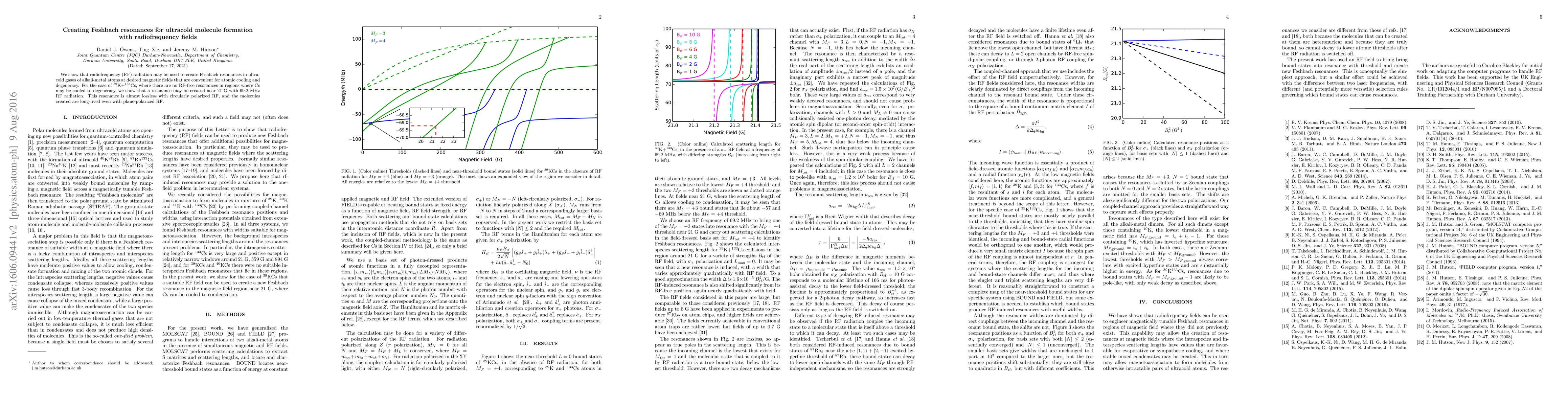 We show that radiofrequency (RF) radiation may be used to create Feshbach resonances in ultracold gases of alkali-metal atoms at desired magnetic fields that are convenient for atomic cooling and degeneracy. For the case of $^{39}$K+$^{133}$Cs, where there are no RF-free resonances in regions where Cs may be cooled to degeneracy, we show that a resonance may be created near 21~G with 69.2~MHz RF radiation. This resonance is almost lossless with circularly polarized RF, and the molecules created are long-lived even with plane-polarized RF.