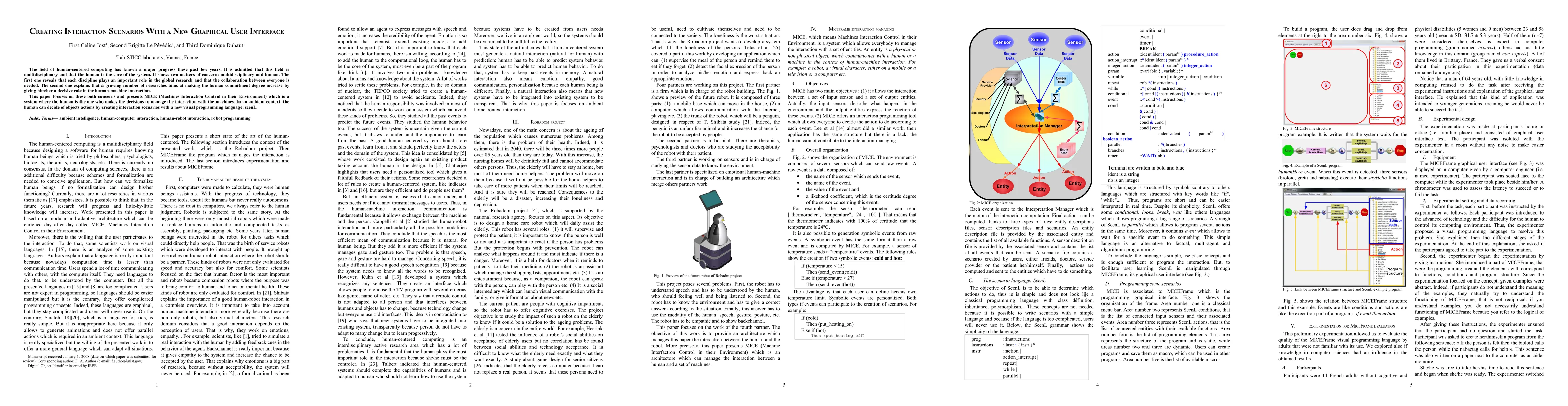 The field of human-centered computing has known a major progress these past few years. It is admitted that this field is multidisciplinary and that the human is the core of the system. It shows two matters of concern: multidisciplinary and human. The first one reveals that each discipline plays an important role in the global research and that the collaboration between everyone is needed. The second one explains that a growing number of researches aims at making the human commitment degree increase by giving him/her a decisive role in the human-machine interaction. This paper focuses on these both concerns and presents MICE (Machines Interaction Control in their Environment) which is a system where the human is the one who makes the decisions to manage the interaction with the machines. In an ambient context, the human can decide of objects actions by creating interaction scenarios with a new visual programming language: scenL.