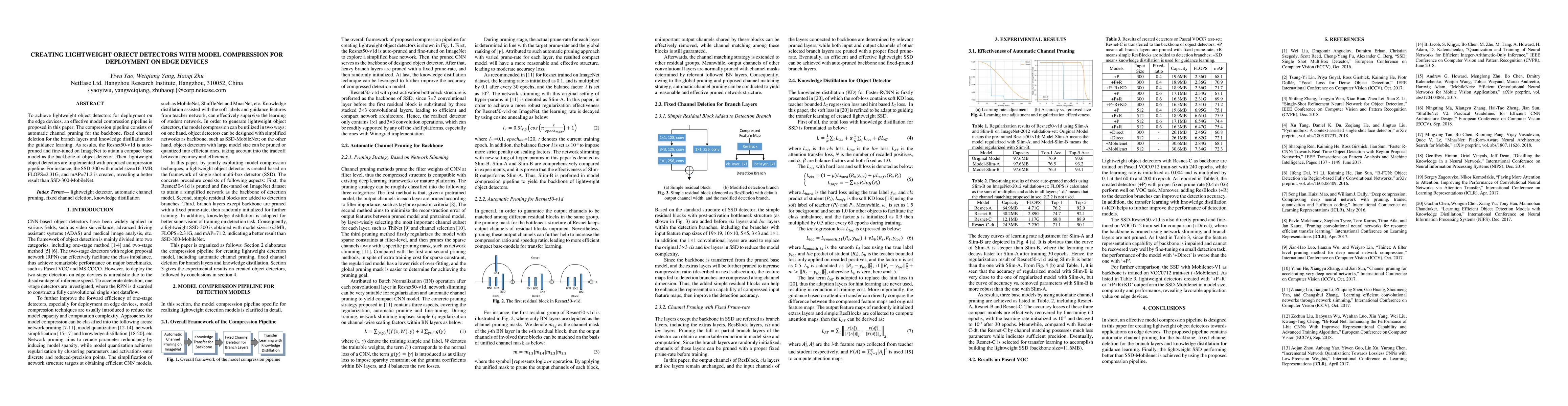 To achieve lightweight object detectors for deployment on the edge devices, an effective model compression pipeline is proposed in this paper. The compression pipeline consists of automatic channel pruning for the backbone, fixed channel deletion for the branch layers and knowledge distillation for the guidance learning. As results, the Resnet50-v1d is auto-pruned and fine-tuned on ImageNet to attain a compact base model as the backbone of object detector. Then, lightweight object detectors are implemented with proposed compression pipeline. For instance, the SSD-300 with model size=16.3MB, FLOPS=2.31G, and mAP=71.2 is created, revealing a better result than SSD-300-MobileNet.
