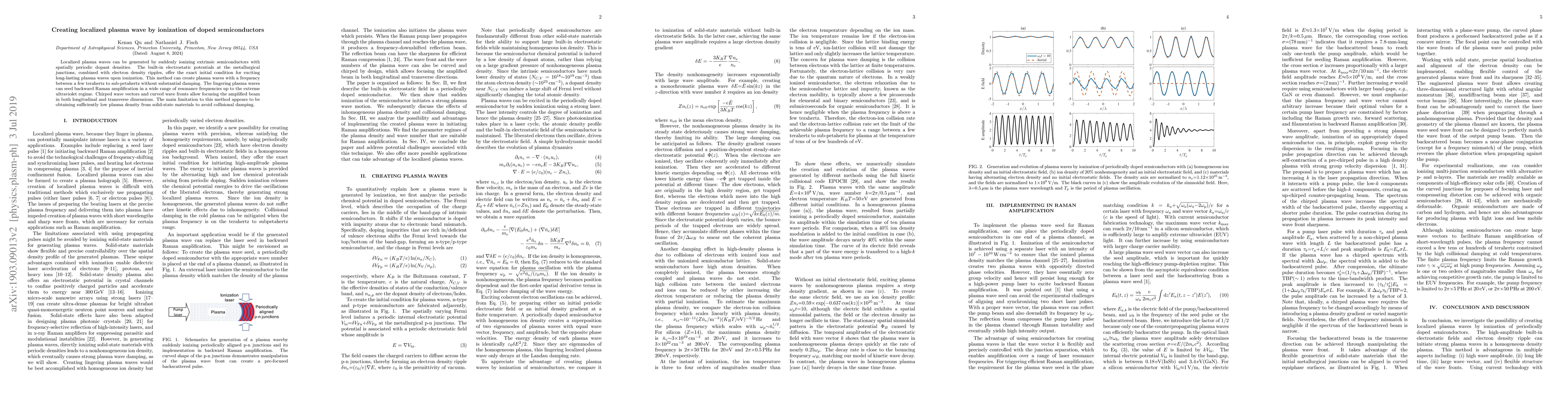 Localized plasma waves can be generated by suddenly ionizing extrinsic semiconductors with spatially periodic dopant densities. The built-in electrostatic potentials at the metallurgical junctions, combined with electron density ripples, offer the exact initial condition for exciting long-lasting plasma waves upon ionization. This method can create plasma waves with a frequency between a few terahertz to sub-petahertz without substantial damping. The lingering plasma waves can seed backward Raman amplification in a wide range of resonance frequencies up to the extreme ultraviolet regime. Chirped wavevectors and curved wavefronts allow focusing the amplified beam in both longitudinal and transverse dimensions. The main limitation to this method appears to be obtaining sufficiently low plasma density from solid-state materials to avoid collisional damping.