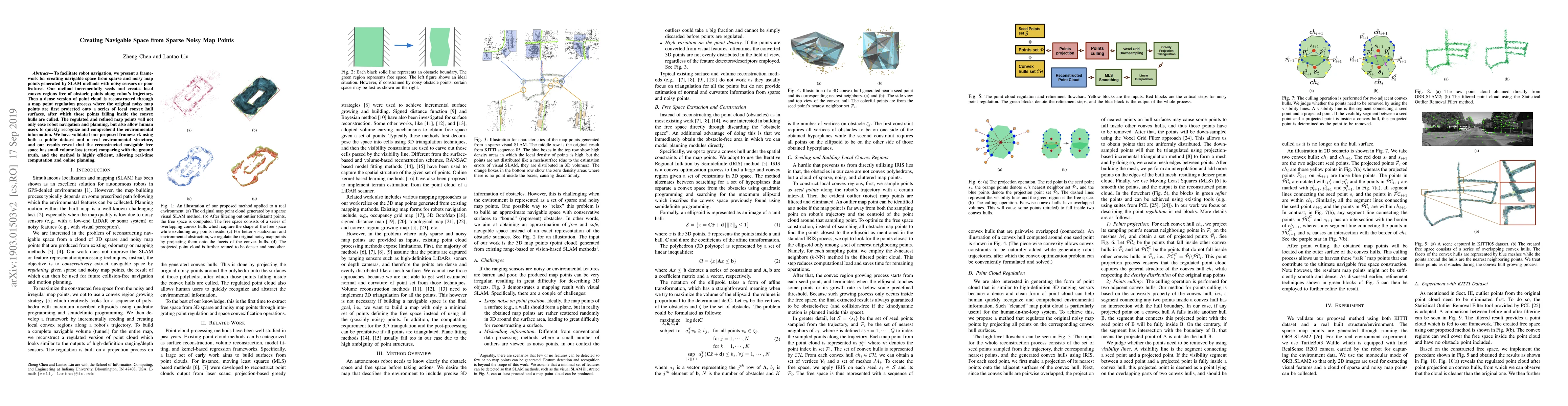 We present a framework for creating navigable space from sparse and noisy map points generated by sparse visual SLAM methods. Our method incrementally seeds and creates local convex regions free of obstacle points along a robot's trajectory. Then a dense version of point cloud is reconstructed through a map point regulation process where the original noisy map points are first projected onto a series of local convex hull surfaces, after which those points falling inside the convex hulls are culled. The regulated and refined map points allow human users to quickly recognize and abstract the environmental information. We have validated our proposed framework using both a public dataset and a real environmental structure, and our results reveal that the reconstructed navigable free space has small volume loss (error) comparing with the ground truth, and the method is highly efficient, allowing real-time computation and online planning.