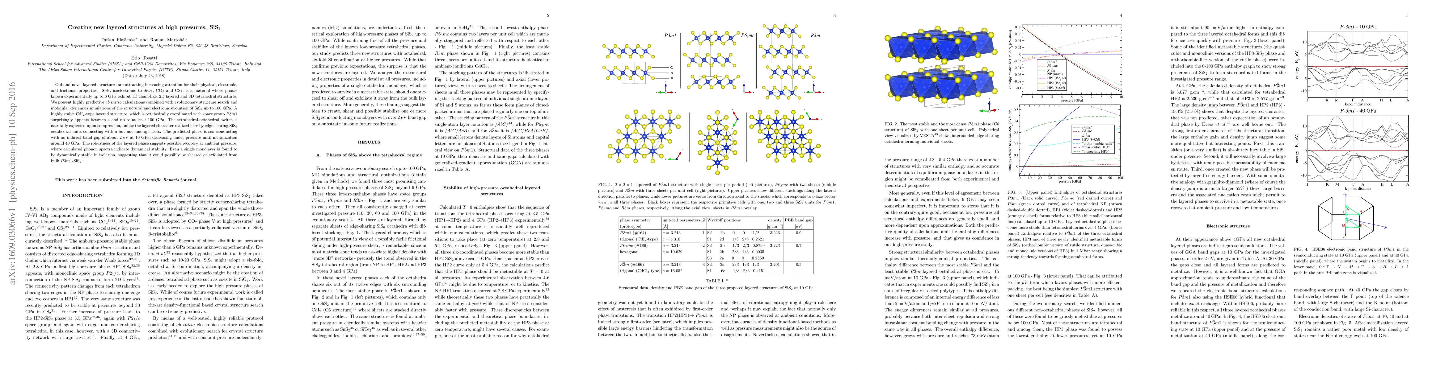Old and novel layered structures are attracting increasing attention for their physical, electronic, and frictional properties. SiS$_2$, isoelectronic to SiO$_2$, CO$_2$ and CS$_2$, is a material whose phases known experimentally up to 6 GPa exhibit 1D chain-like, 2D layered and 3D tetrahedral structures. We present highly predictive $ab$ $initio$ calculations combined with evolutionary structure search and molecular dynamics simulations of the structural and electronic evolution of SiS$_2$ up to 100 GPa. A highly stable CdI$_2$-type layered structure, which is octahedrally coordinated with space group $P\bar{3}m1$ surprisingly appears between 4 and up to at least 100 GPa. The tetrahedral-octahedral switch is naturally expected upon compression, unlike the layered character realized here by edge-sharing SiS$_6$ octahedral units connecting within but not among sheets. The predicted phase is semiconducting with an indirect band gap of about 2 eV at 10 GPa, decreasing under pressure until metallization around 40 GPa. The robustness of the layered phase suggests possible recovery at ambient pressure, where calculated phonon spectra indicate dynamical stability. Even a single monolayer is found to be dynamically stable in isolation, suggesting that it could possibly be sheared or exfoliated from bulk $P\bar{3}m1$-SiS$_2$.
