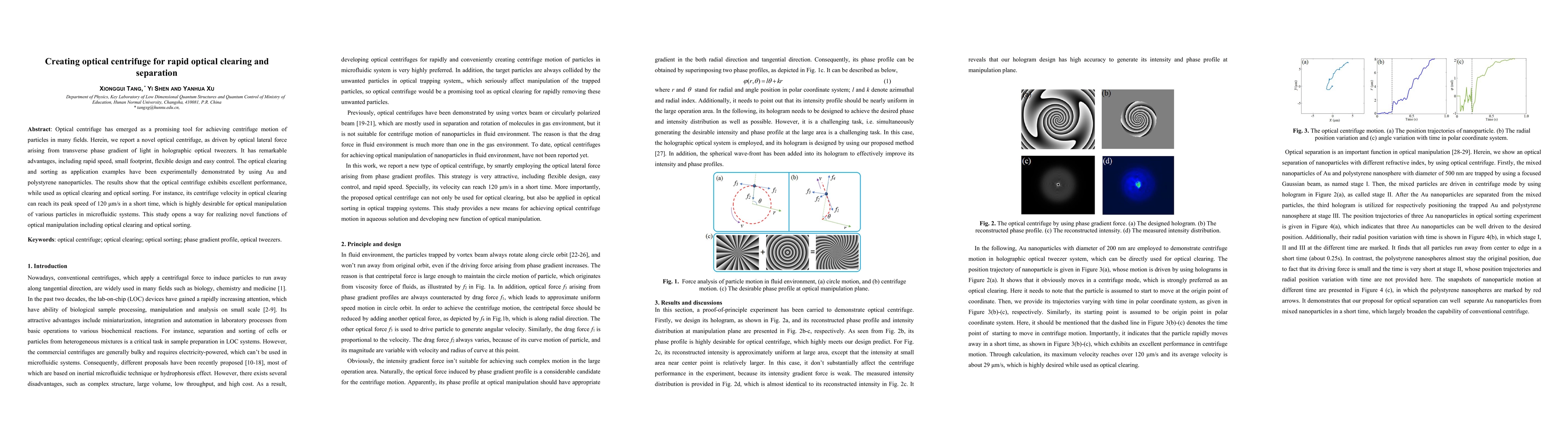 This paper introduces a novel optical centrifuge driven by optical lateral forces, demonstrating rapid particle separation and clearing at speeds up to 120 μm/s. The device's compact, flexible design and ease of control make it highly effective for optical manipulation in microfluidic systems.