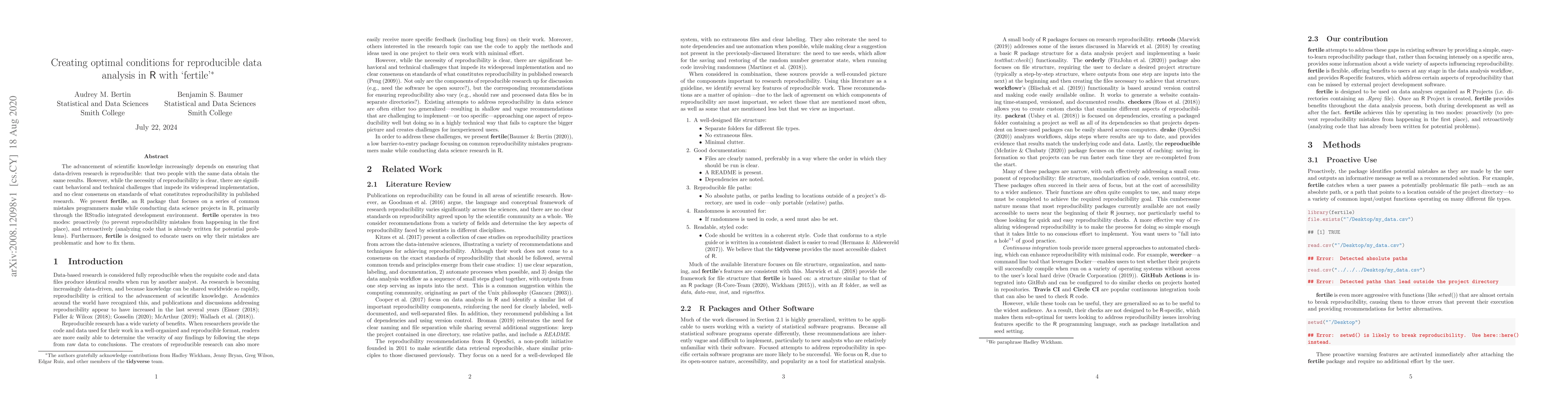The advancement of scientific knowledge increasingly depends on ensuring that data-driven research is reproducible: that two people with the same data obtain the same results. However, while the necessity of reproducibility is clear, there are significant behavioral and technical challenges that impede its widespread implementation, and no clear consensus on standards of what constitutes reproducibility in published research. We present fertile, an R package that focuses on a series of common mistakes programmers make while conducting data science projects in R, primarily through the RStudio integrated development environment. fertile operates in two modes: proactively (to prevent reproducibility mistakes from happening in the first place), and retroactively (analyzing code that is already written for potential problems). Furthermore, fertile is designed to educate users on why their mistakes are problematic and how to fix them.