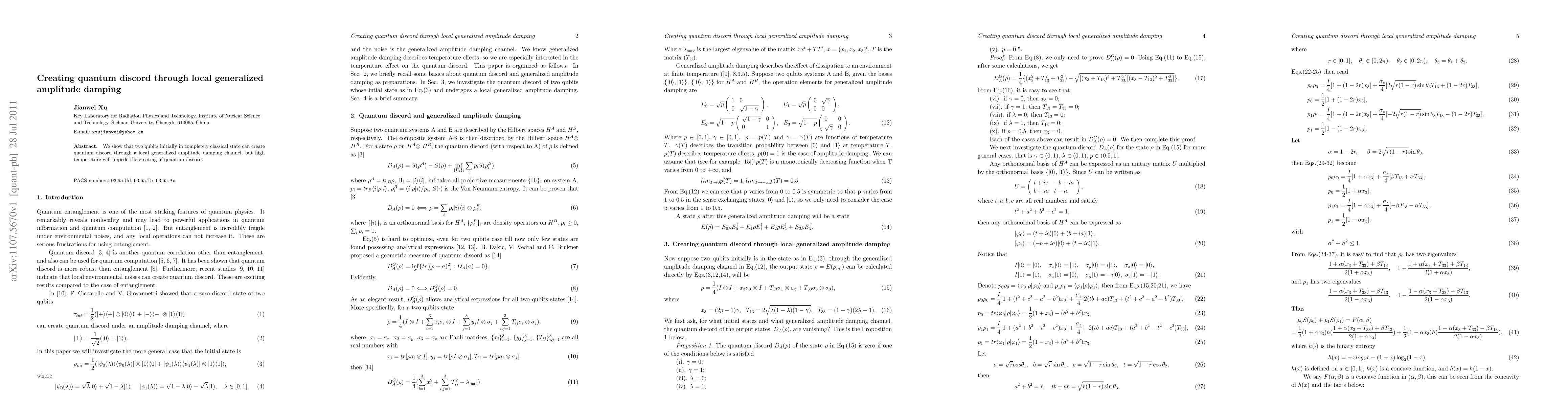 Summary: This paper demonstrates that two initially classical qubits can generate quantum discord via a local generalized amplitude damping channel, although high temperatures hinder this process.