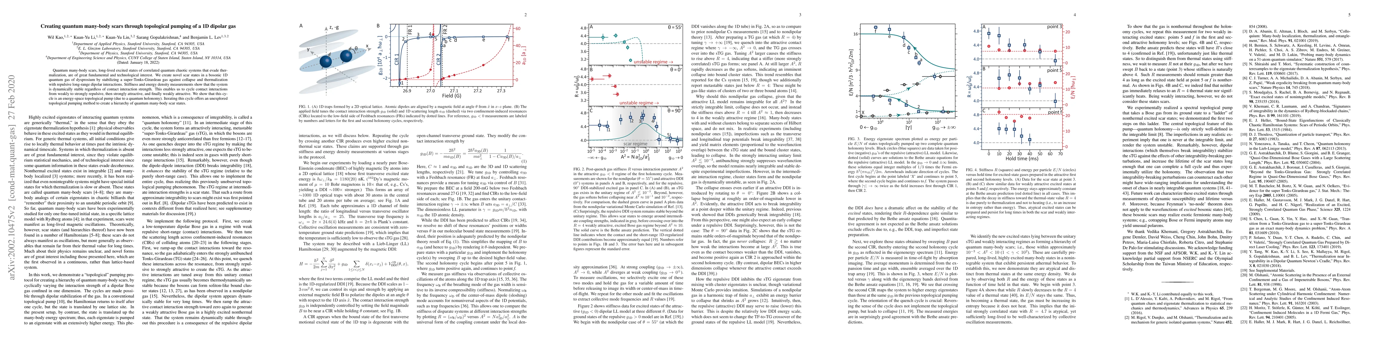 Quantum many-body scars, long-lived excited states of correlated quantum chaotic systems that evade thermalization, are of great fundamental and technological interest. We create novel scar states in a bosonic 1D quantum gas of dysprosium by stabilizing a super-Tonks-Girardeau gas against collapse and thermalization with repulsive long-range dipolar interactions. Stiffness and energy density measurements show that the system is dynamically stable regardless of contact interaction strength. This enables us to cycle contact interactions from weakly to strongly repulsive, then strongly attractive, and finally weakly attractive. We show that this cycle is an energy-space topological pump (due to a quantum holonomy). Iterating this cycle offers an unexplored topological pumping method to create a hierarchy of quantum many-body scar states.