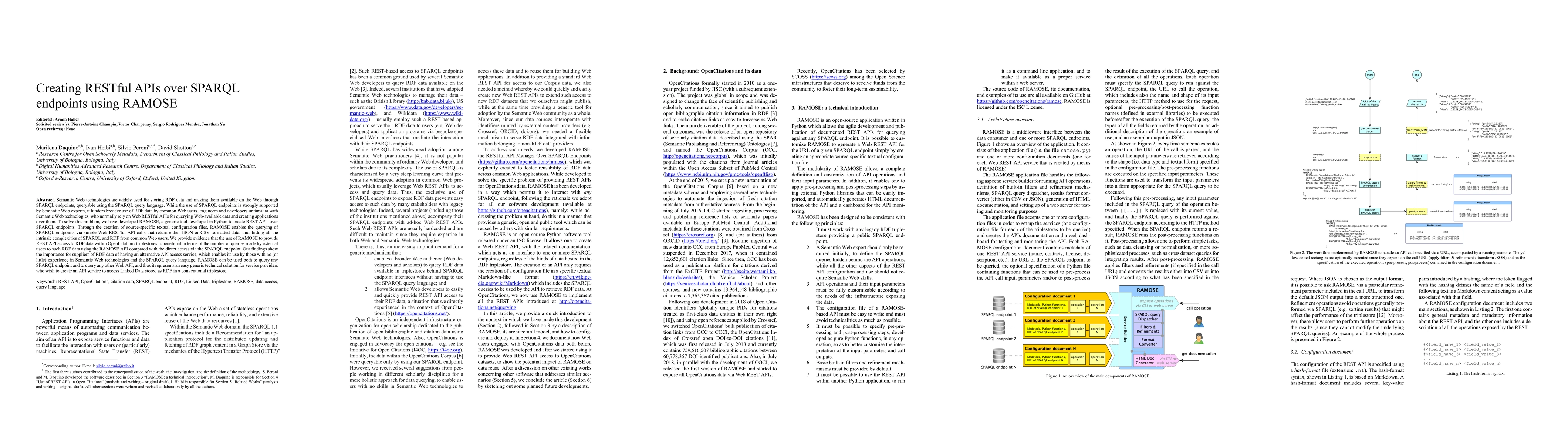 RAMOSE is a Python tool that creates RESTful APIs over SPARQL endpoints, simplifying access to RDF data for non-expert users by converting SPARQL queries into RESTful API calls that return JSON or CSV data. Usage of RAMOSE in OpenCitations shows increased external queries compared to direct SPARQL access, indicating its value for broadening RDF data accessibility.