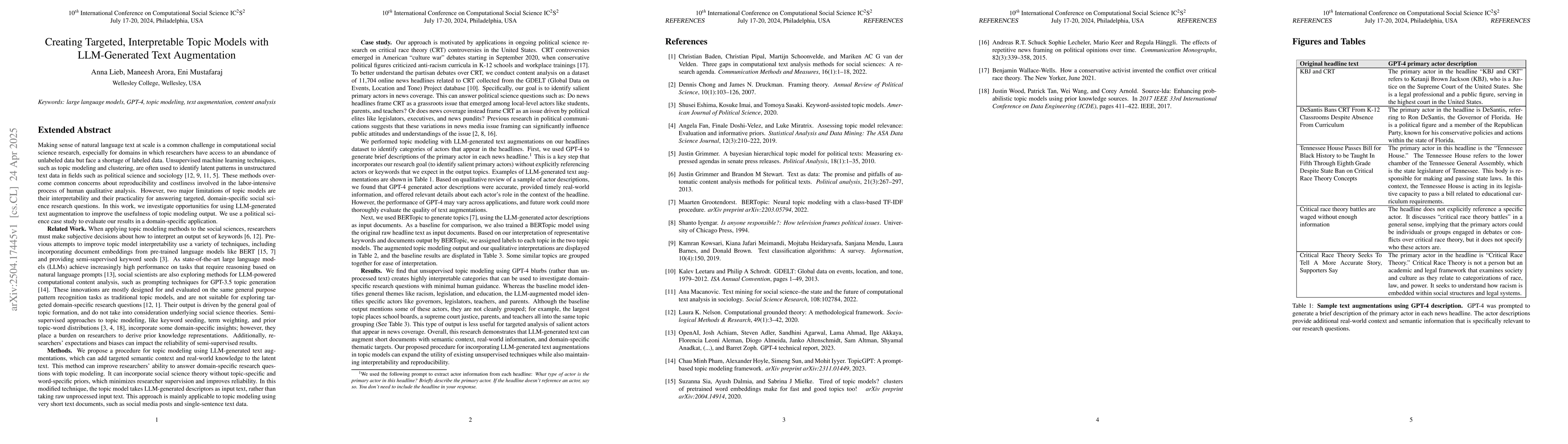 This paper explores enhancing topic modeling interpretability and utility through LLM-generated text augmentation, demonstrating improved results in a political science case study. The approach leverages GPT-4 to create more interpretable categories for targeted, domain-specific research questions.