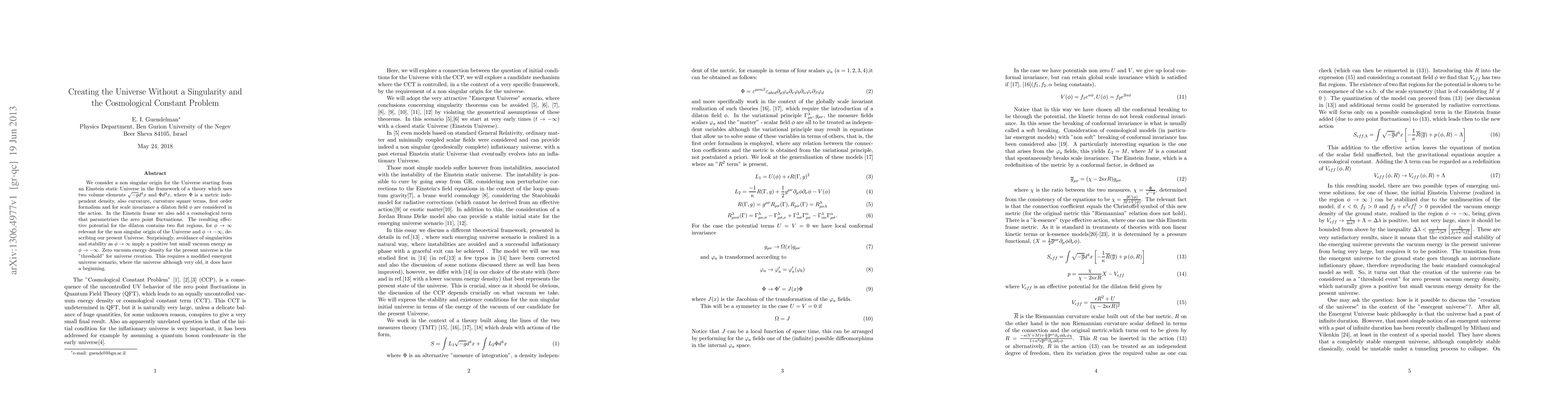 The research uses a non-singular origin for the Universe starting from an Einstein static Universe in the framework of a theory which uses two volume elements $ ext{ð}-{g}$d^{4}x$ and $ ext{ö}$d^{4}x$, where $ ext{ö}$ is a metric independent density.