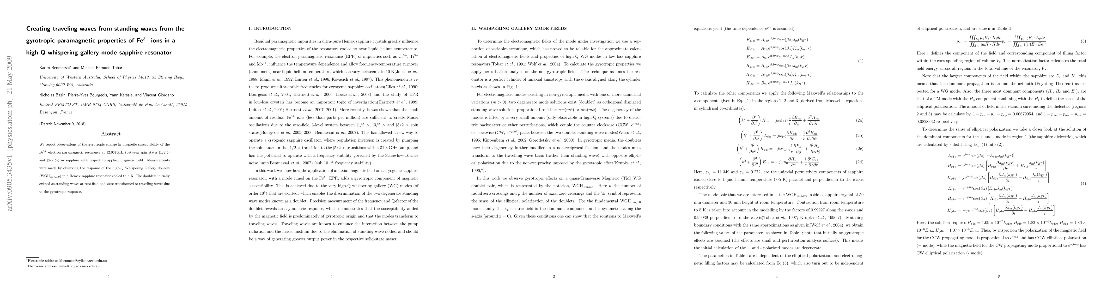 This research demonstrates the transformation of standing waves into traveling waves in a high-Q whispering gallery mode sapphire resonator due to the gyrotropic paramagnetic properties of Fe$^{3+}$ ions under an applied magnetic field. The study observes the electron paramagnetic resonance at 12.037 GHz in sapphire cooled to 5 K.