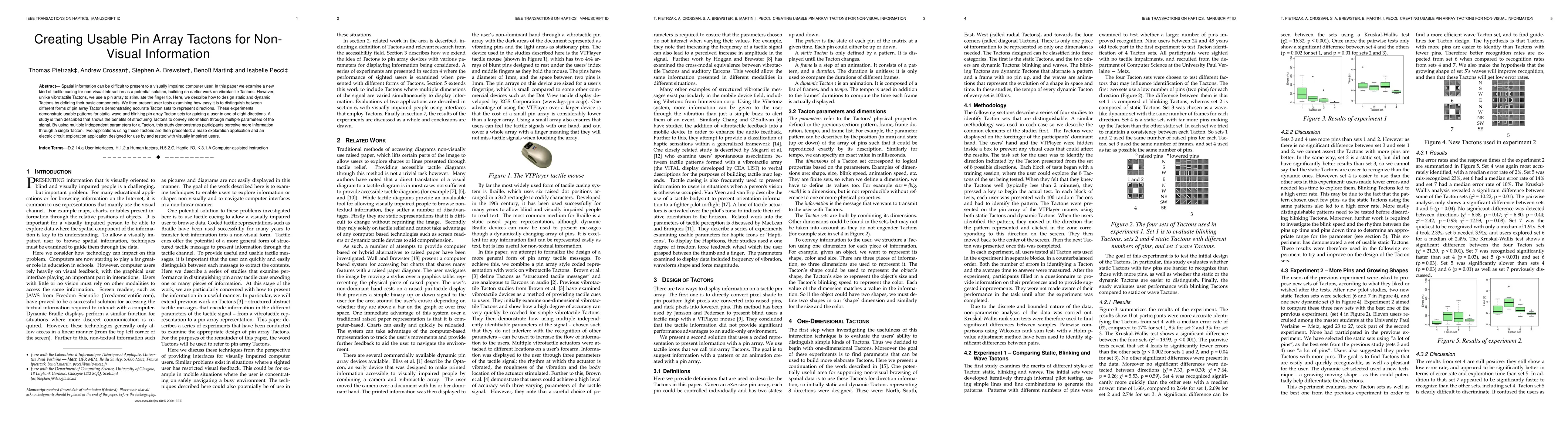 This paper explores the design of pin array Tactons for non-visual interaction, presenting methods to create static and dynamic tactile cues. User tests demonstrate effective patterns for directional guidance, and studies show enhanced information perception through multiple signal parameters, with applications in maze and circuit exploration for visually impaired users.