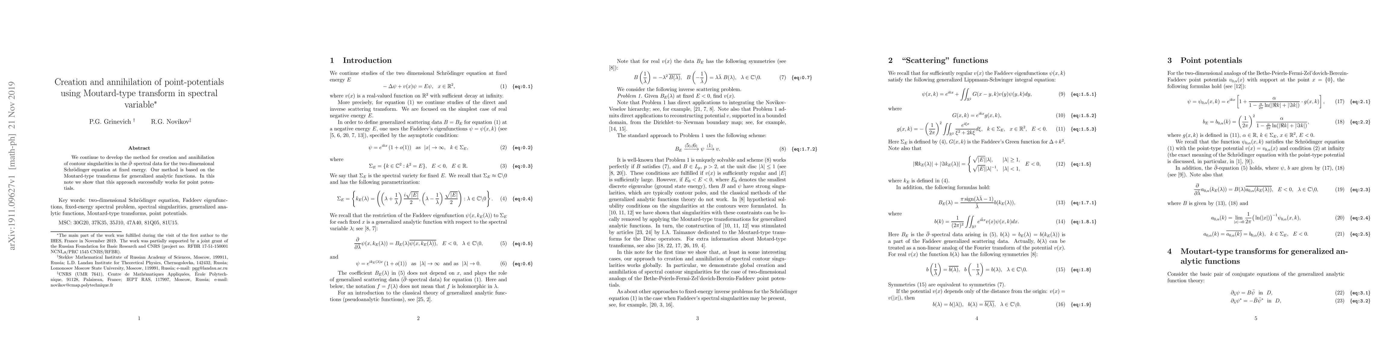 The paper introduces a method using Moutard-type transforms to create and annihilate contour singularities in spectral data for 2D Schrödinger equations at fixed energy. It demonstrates the successful application of this technique to point potentials.