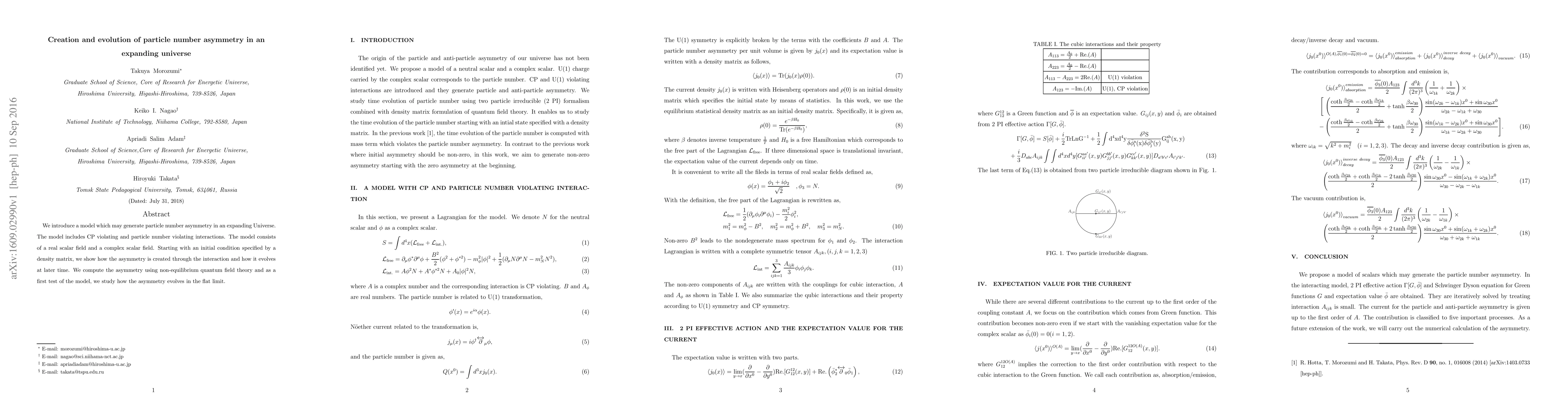 This paper proposes a model generating particle number asymmetry in an expanding universe through CP and particle number violating interactions involving a real and a complex scalar field. The study uses non-equilibrium quantum field theory to compute the asymmetry and examines its evolution in the flat limit.