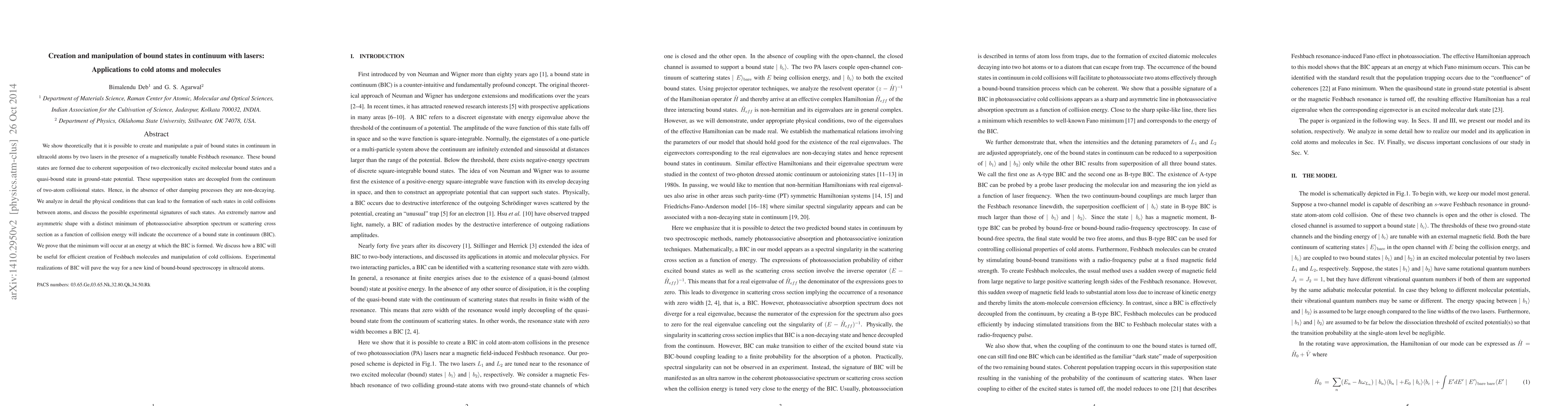 This paper theoretically demonstrates the creation and manipulation of bound states in continuum (BIC) in ultracold atoms using lasers and magnetically tunable Feshbach resonances. The BIC, formed by coherent superposition of excited molecular states and ground-state potentials, exhibits non-decaying properties and can be identified by narrow, asymmetric features in photoassociative absorption spectra.