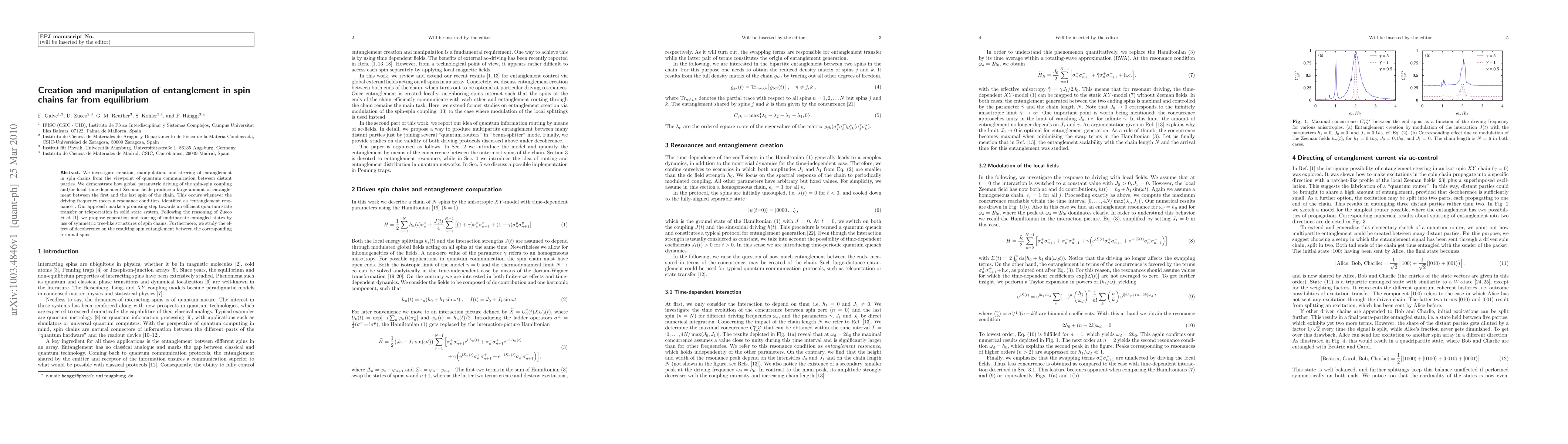 We investigate creation, manipulation, and steering of entanglement in spin chains from the viewpoint of quantum communication between distant parties. We demonstrate how global parametric driving of the spin-spin coupling and/or local time-dependent Zeeman fields produce a large amount of entanglement between the first and the last spin of the chain. This occurs whenever the driving frequency meets a resonance condition, identified as "entanglement resonance". Our approach marks a promising step towards an efficient quantum state transfer or teleportation in solid state system. Following the reasoning of Zueco et al. [1], we propose generation and routing of multipartite entangled states by use of symmetric tree-like structures of spin chains. Furthermore, we study the effect of decoherence on the resulting spin entanglement between the corresponding terminal spins.