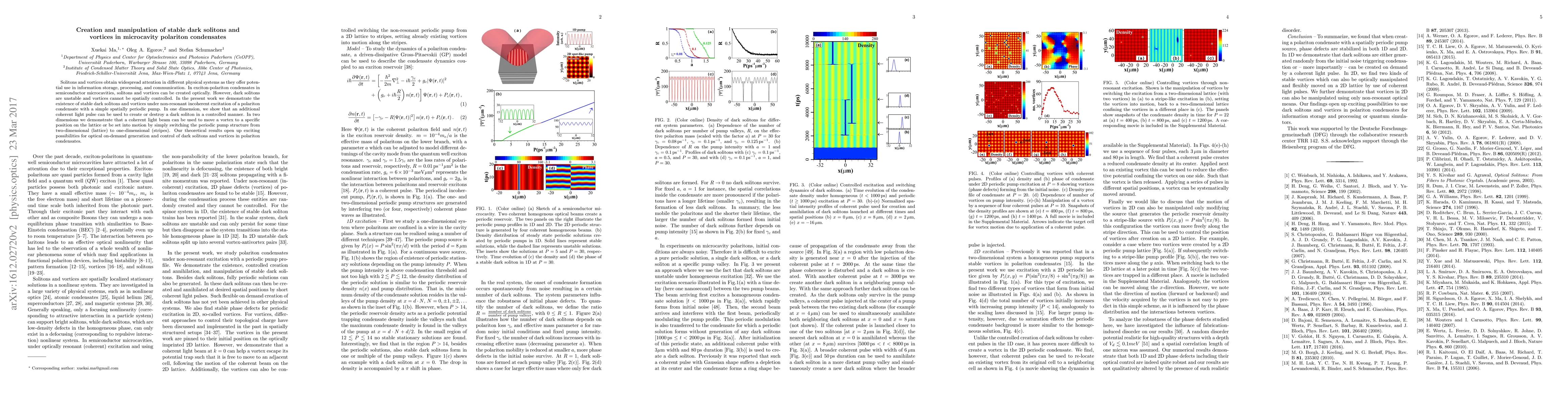 This paper demonstrates the creation and manipulation of stable dark solitons and vortices in exciton-polariton condensates using non-resonant incoherent excitation and spatially periodic pumps. It shows controlled dark soliton generation and vortex positioning in one and two dimensions, respectively, with potential applications in optical information processing.