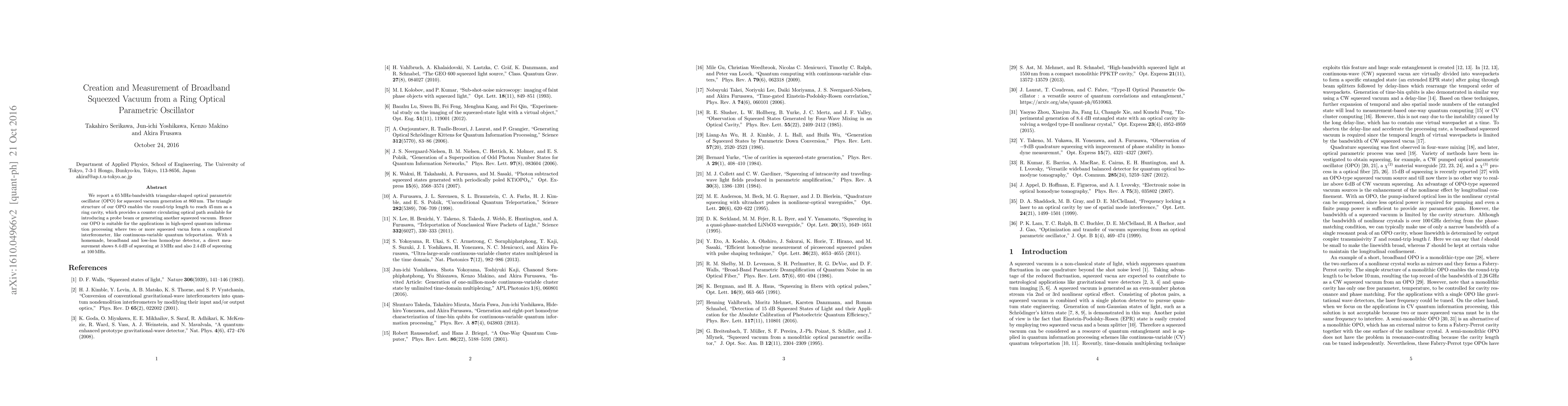 This paper details the creation of a broadband squeezed vacuum using a 65MHz-bandwidth triangular optical parametric oscillator (OPO) at 860nm, achieving 8.4dB of squeezing at 3MHz and 2.4dB at 100MHz. The OPO's ring cavity design facilitates high-speed quantum information processing applications.