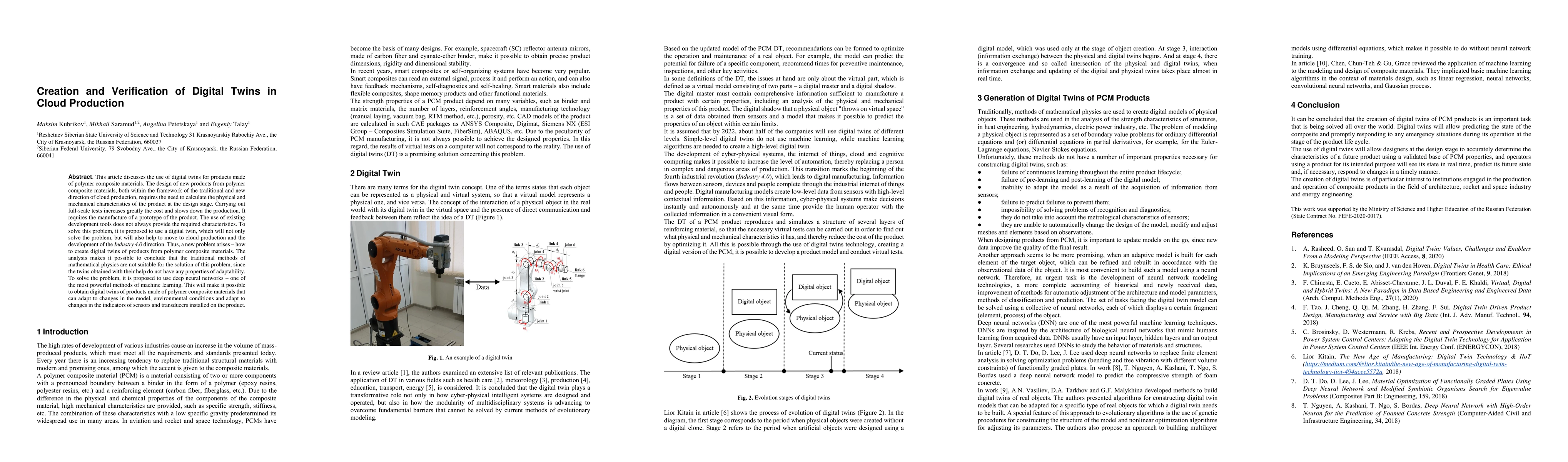 This article discusses the use of digital twins for products made of polymer composite materials. The design of new products from polymer composite materials, both within the framework of the traditional and new direction of cloud production, requires the need to calculate the physical and mechanical characteristics of the product at the design stage. Carrying out full-scale tests increases greatly the cost and slows down the production. It requires the manufacture of a prototype of the product. The use of existing development tools does not always provide the required characteristics. To solve this problem, it is proposed to use a digital twin, which will not only solve the problem, but will also help to move to cloud production and the development of the Industry 4.0 direction. Thus, a new problem arises - how to create digital twins of products from polymer composite materials. The analysis makes it possible to conclude that the traditional methods of mathematical physics are not suitable for the solution of this problem, since the twins obtained with their help do not have any properties of adaptability. To solve the problem, it is proposed to use deep neural networks one of the most powerful methods of machine learning. This will make it possible to obtain digital twins of products made of polymer composite materials that can adapt to changes in the model, environmental conditions and adapt to changes in the indicators of sensors and transducers installed on the product.