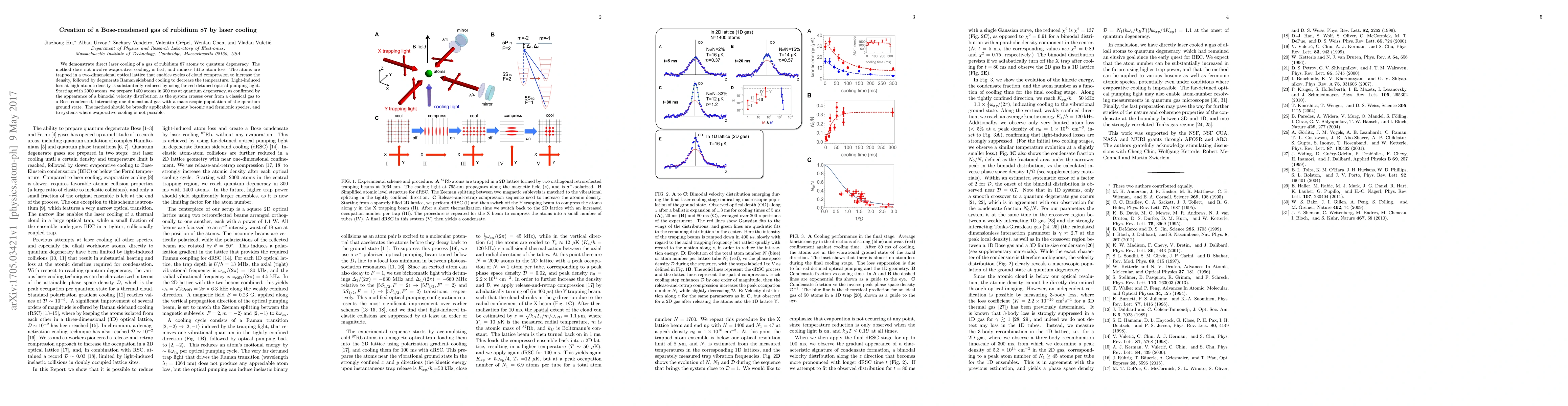 The research demonstrates direct laser cooling of a rubidium-87 gas to quantum degeneracy using a two-dimensional optical lattice. The method involves cycles of cloud compression followed by degenerate Raman sideband cooling, with light-induced loss at high atomic density reduced by far-red detuned optical pumping light.