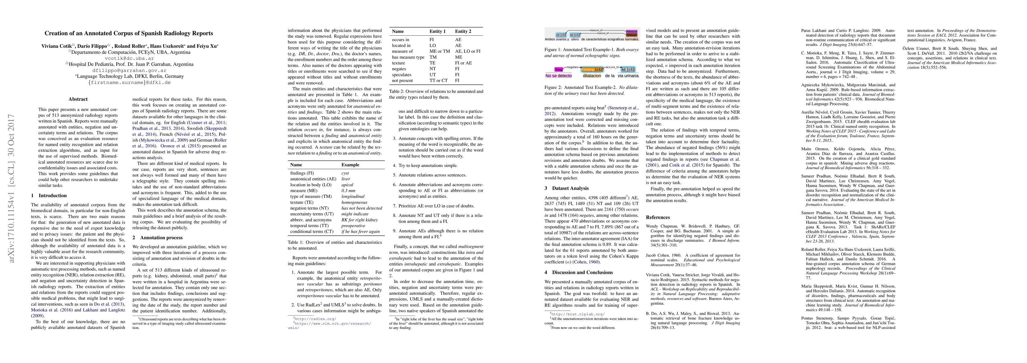 This paper introduces a new annotated corpus of 513 Spanish radiology reports, enriched with entities, negation, and uncertainty terms, aimed at evaluating named entity recognition and relation extraction algorithms. The work also offers guidelines for creating similar annotated biomedical resources.