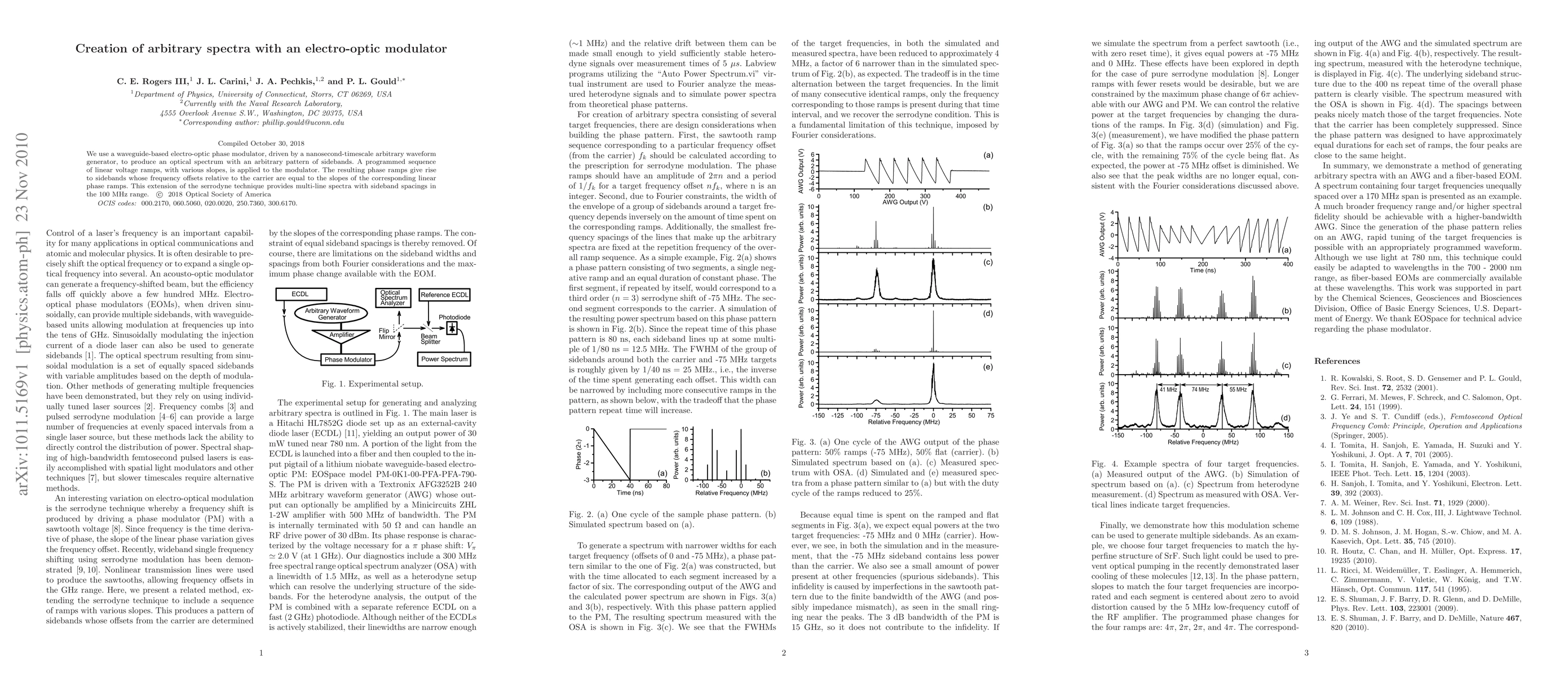 This paper details the creation of customizable optical spectra using a waveguide-based electro-optic phase modulator driven by an arbitrary waveform generator. The technique generates sidebands with frequency offsets proportional to the slopes of programmed linear voltage ramps, achieving sideband spacings up to 100 MHz.